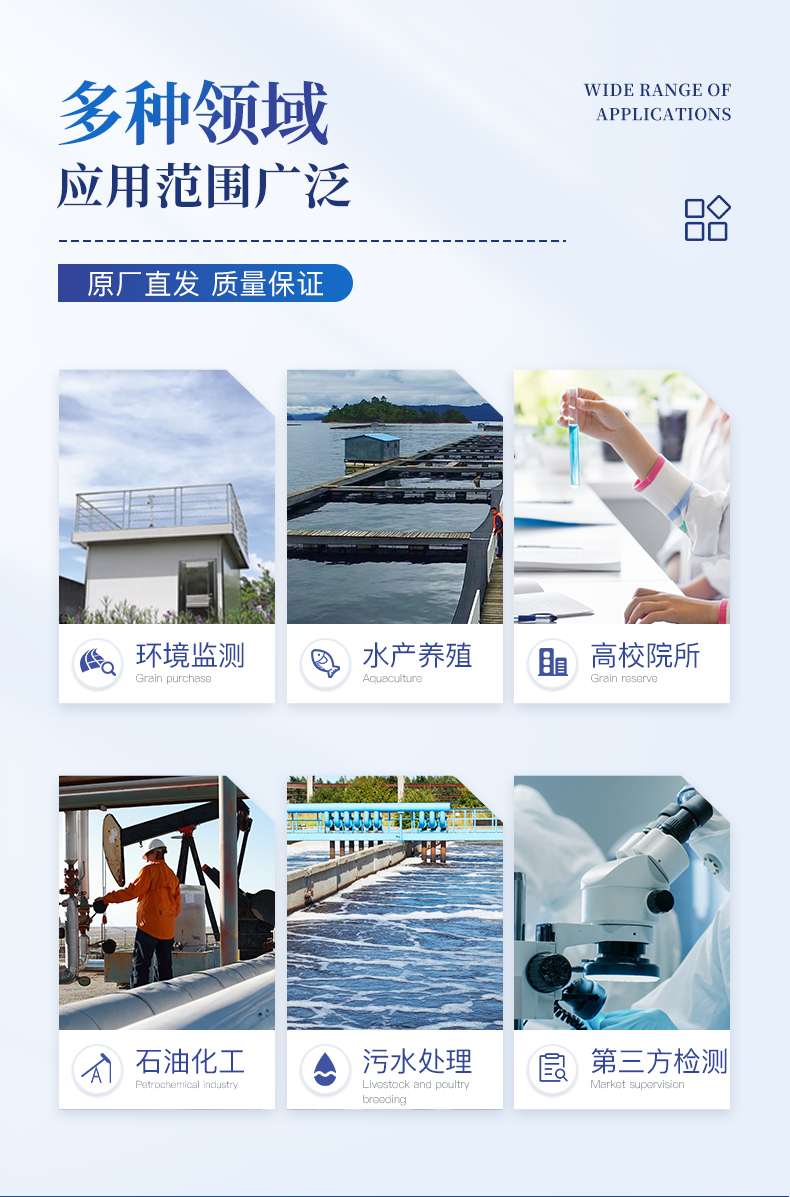 适用于生活污水、工业废水、地下水、地表水中多种水质污染物的检测;运用于水质检测实验室、市政、污水处理厂、环境监测站及教育科研高校、电厂、疾控中心、造纸电镀、水产养殖、生物制药、石化、煤炭、冶金、纺织、食品等行业的水质分析。