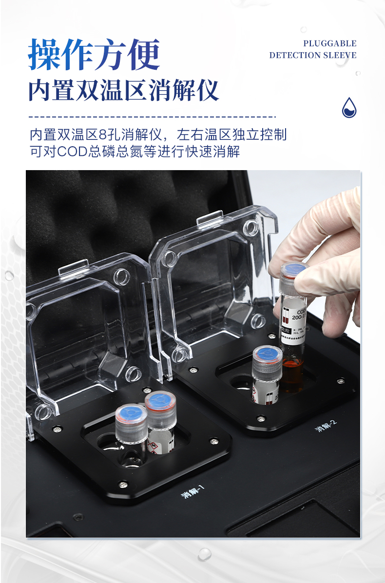 4、内置双温区8孔消解仪,左右温区独立控制,可对COD总磷总氮等进行快速消解。