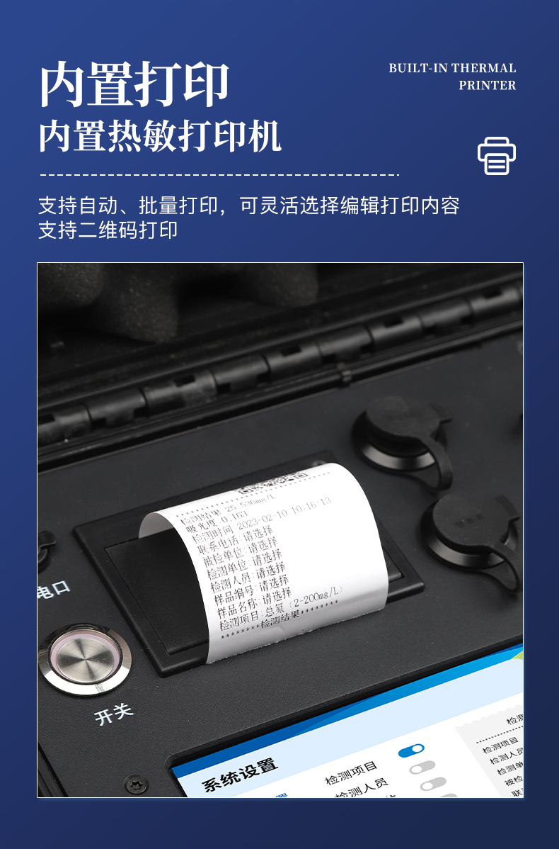 6、内置热敏打印机,支持自动、批量打印,可灵活选择、编辑打印内容,支持二维码打印。