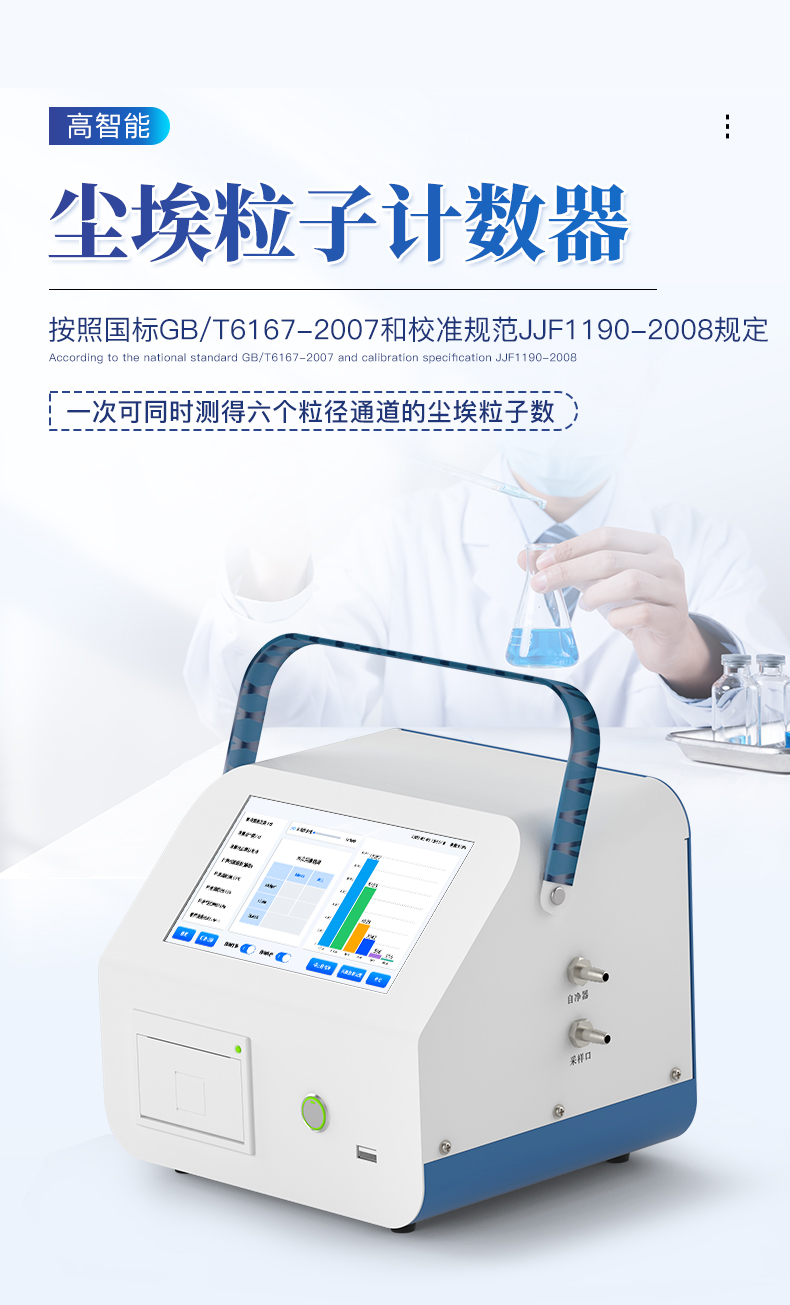 智能尘埃粒子计数器,其置信度测量检定标准按照国标GB/T6167-2007和校准规范JJF1190-2008规定的条件,对净化级别进行自动判断。一次采样可同时测得六个粒径通道的尘埃粒子数,并同时显示六个粒径通道粒子的数目及其变化情况。
