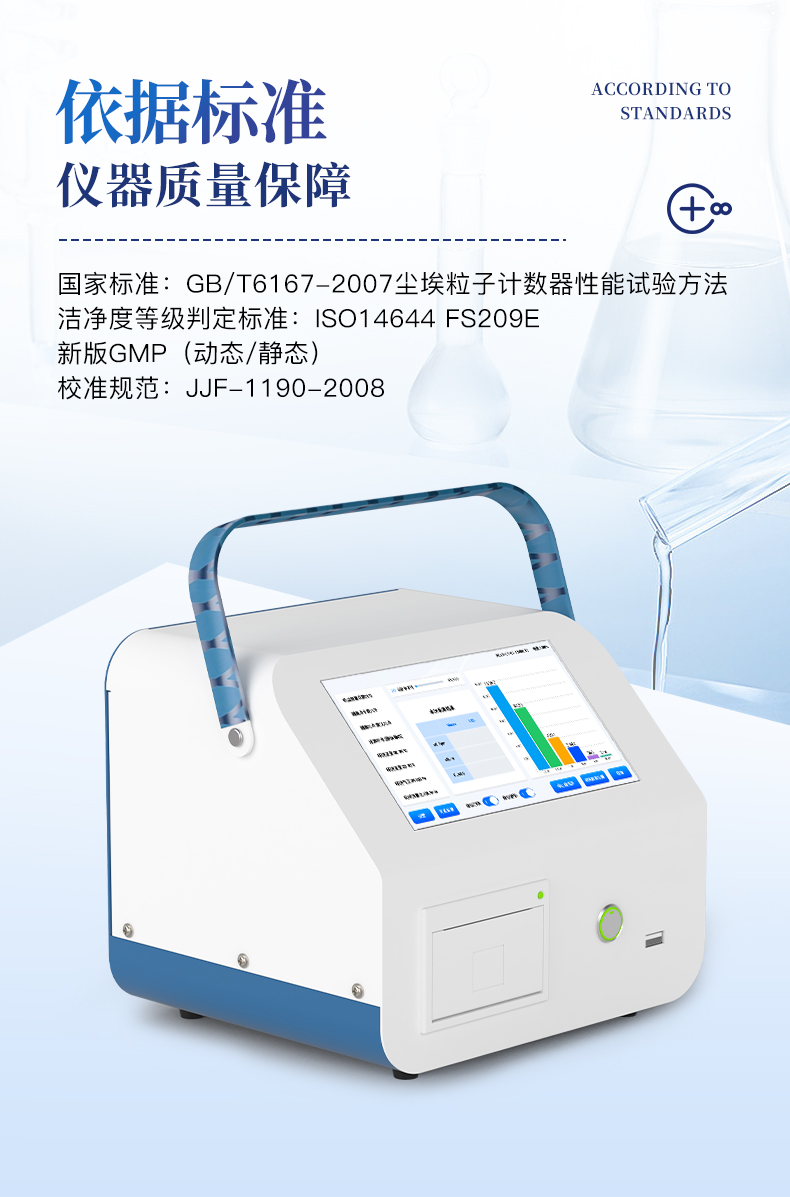 国家标准:GB/T6167-2007尘埃粒子计数器性能试验方法 洁净度等级判定标准:ISO14644 FS209E ,新版GMP(动态/静态) 校准规范:JJF-1190-2008