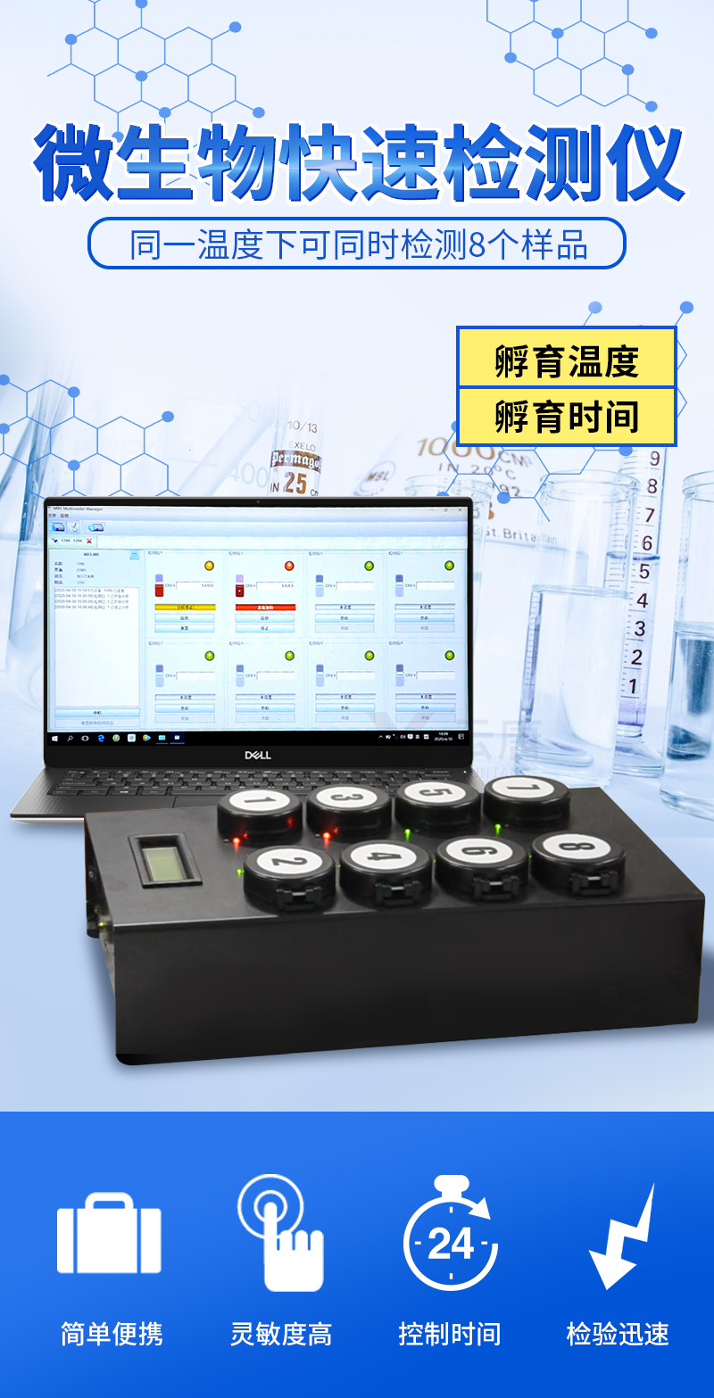 4) 检测样本只需1ml/1g;同一温度下可同时检测8个样品;