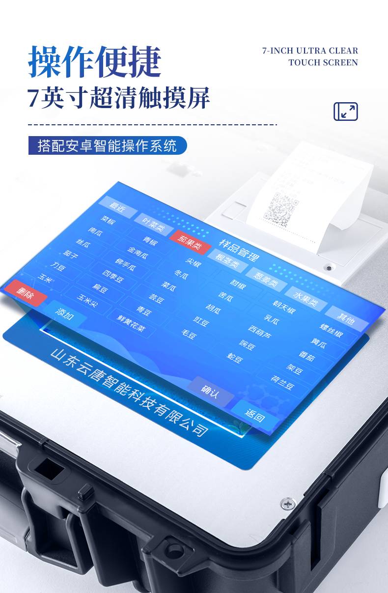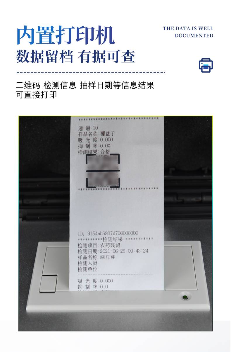 显示方式:≥5英寸液晶触摸屏显示,人性化中文操作界面,读数直观、简单。配备嵌入式高速热敏打印机,可选择手动打印或者自动打印,三分钟出打印结果。光源采用进口超高亮发光二极管,具有低功耗、稳定性强、高灵敏度,高检测精度,高重复性精度,光源可控、响应速度快等优点。采用标准USB接口设计,免驱动安装,方便数据的存贮和移动,并可随时与计算机直接相连,并且可用计算机控制仪器。实现数据查询、浏览、分析、统计、打印等。智能化程度高,仪器具有自检功能:具有开机自检和调零功能,具有自动检测重复性功能内置强大的数据库,可在仪器上直接选择样品名称、检测指标、送检单位等信息,也可在仪器上直接编辑录入样品名称、检测指标、送检单位等信息并保存进样品数据库。支持Wifi网络,数据可局域网和互联网数据上传,检测结果直接传至食品安全监管平台。进行区域食品安全监管及大数据分析处理,检测区域食品安全长短期动态,达到食品安全问题预估、预警