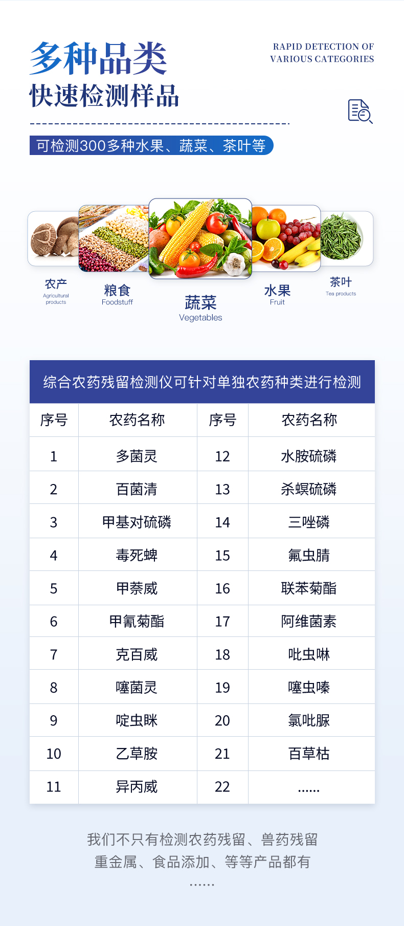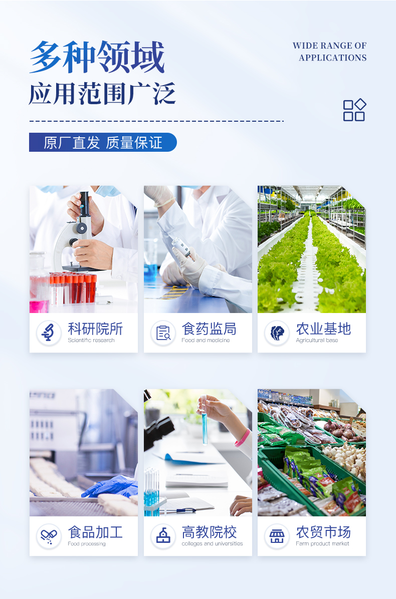此外还可用于果蔬茶生产基地和农贸批发销售市场现场检测,餐馆、学校、食堂、家庭果蔬加工前的安全速测等。