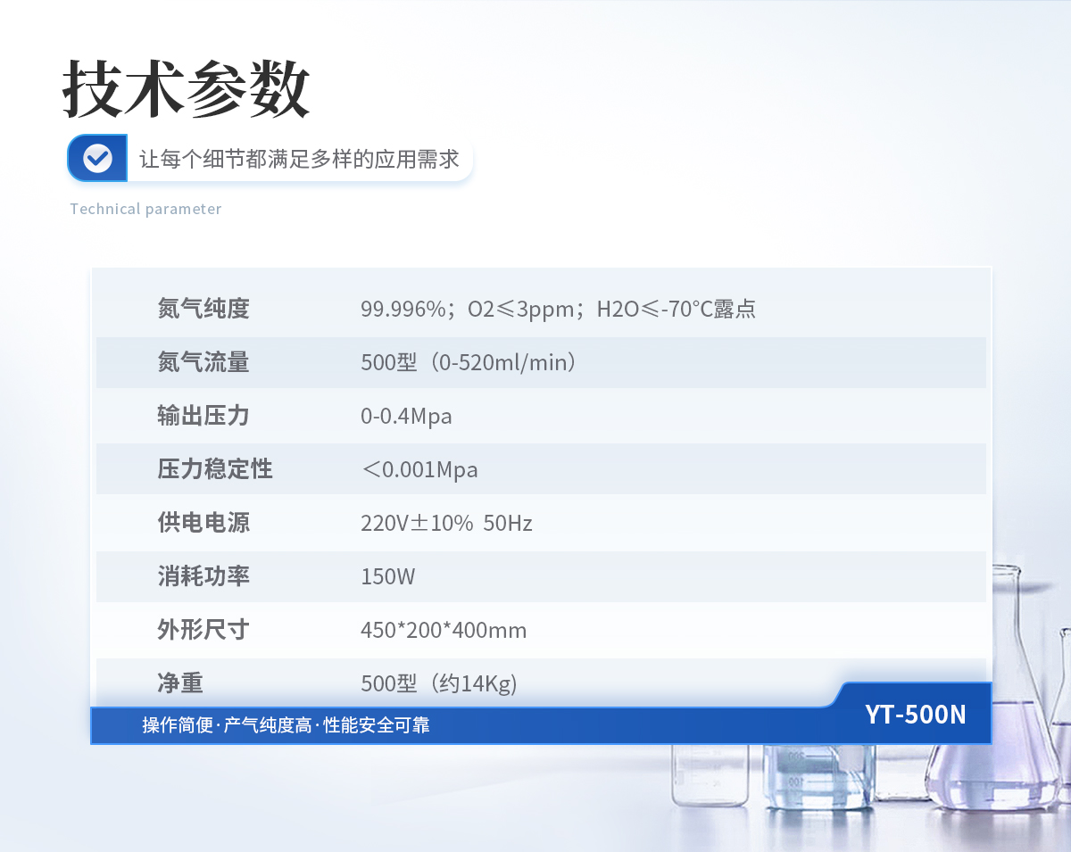 | 1、氮气纯度: 99.996%;O2≤3ppm;H2O≤-70℃露点 | 2、氮气流量: 0-320ml/min | 3、输出压力: 0-0.4Mpa | 4、压力稳定性:<0.001Mpa | 5、供电电源: 220V±10% 50Hz | 6、消耗功率: 120W | 7、外形尺寸: 450*200*400mm | 8、净重: 300型(约14Kg) |