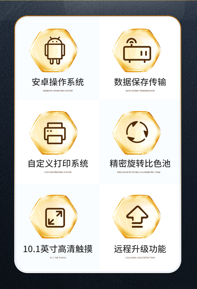 1、仪器采用台式一体化系统检测技术,将分光光度模块、胶体金检测模块、新型农残检测模块、数字化管理模块、无线通讯模块高度集成于一体,支持检测200种食品安全检测项目,同时预留升级检测方法。
