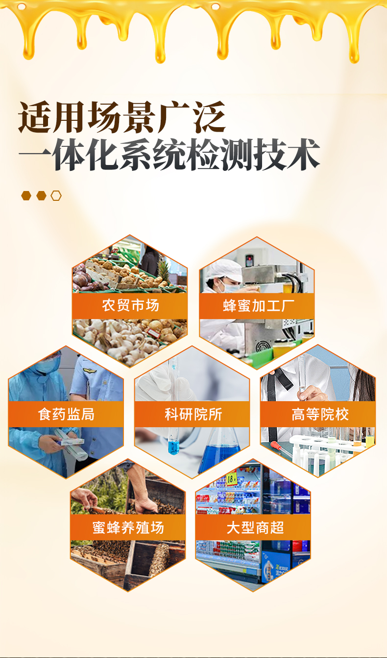 该蜂蜜检测仪为集成化食品安全快速检测分析设备,目前已于食药监局、市场监督部门、高教院校、科研院所、农业部门、蜜蜂养殖场、蜂蜜加工厂等单位广泛使用。 。