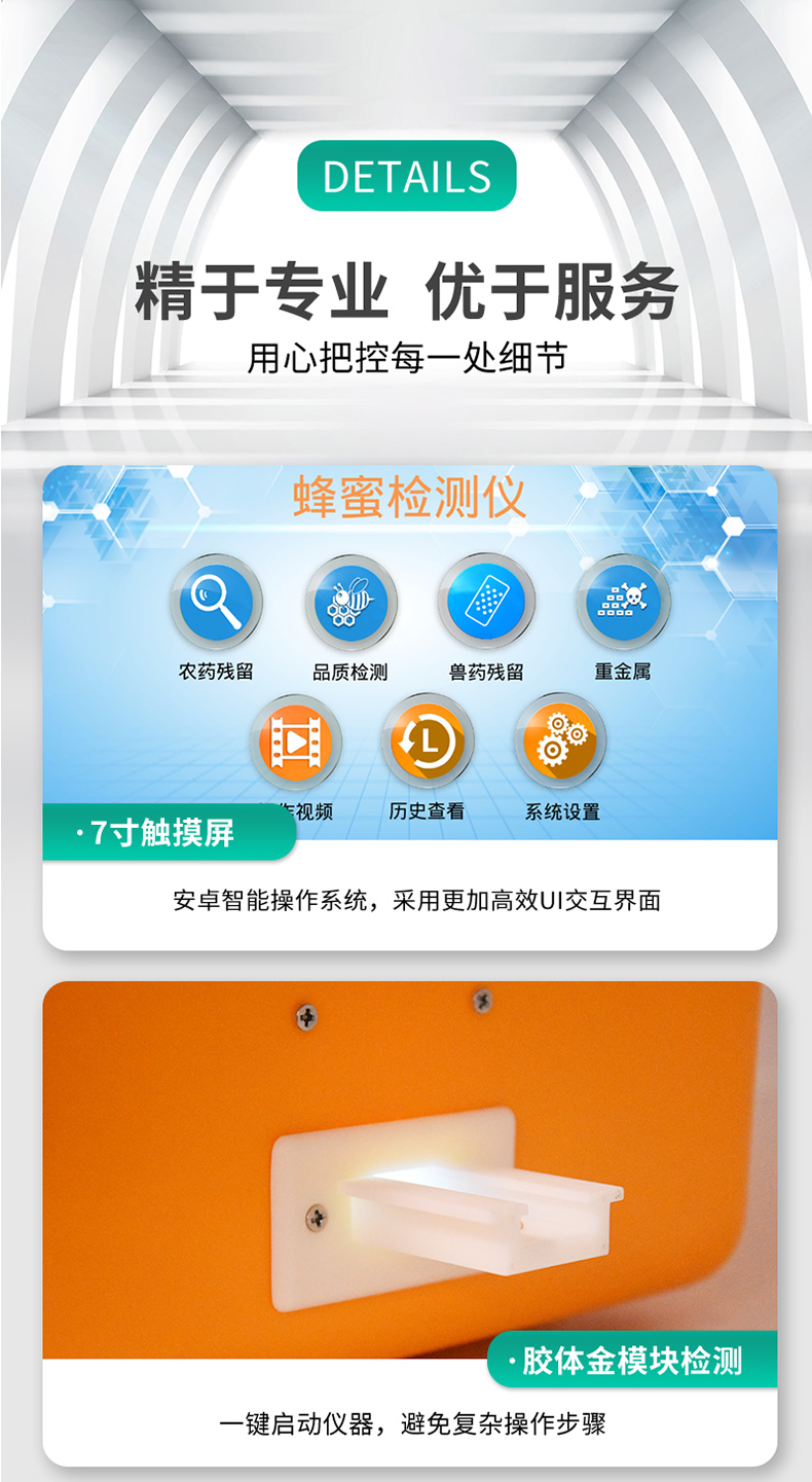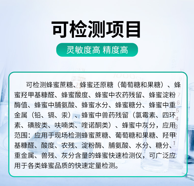 检测项目:蜂蜜蔗糖、蜂蜜还原糖(葡萄糖和果糖)、蜂蜜羟甲基糠醛、蜂蜜酸度、蜂蜜中农药残留、蜂蜜淀粉酶值、蜂蜜中脯氨酸、蜂蜜水分、蜂蜜糖分、蜂蜜中重金属(铅、镉、汞)、蜂蜜中抗生素(氯霉素、四环素、磺胺类、呋喃类、喹诺酮类)、蜂蜜中灰分,可广泛应用于各类蜂蜜品质的快速定量检测。
