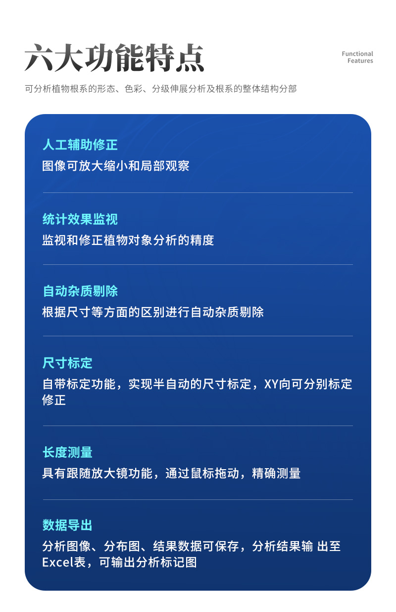 本软根系分析软件可以读取TIFF,JPEG标准格式的图像。针对获取的图像,利用插入加密狗解密的软件,对扫描获得的高质量根系图像进行分析。采用非统计学方法测量计算出交叉重叠部分根系长度、直径、面积、体积、根尖等基本的形态学参数。从而满足研究者针对植物根系不同类别和层次的研究。