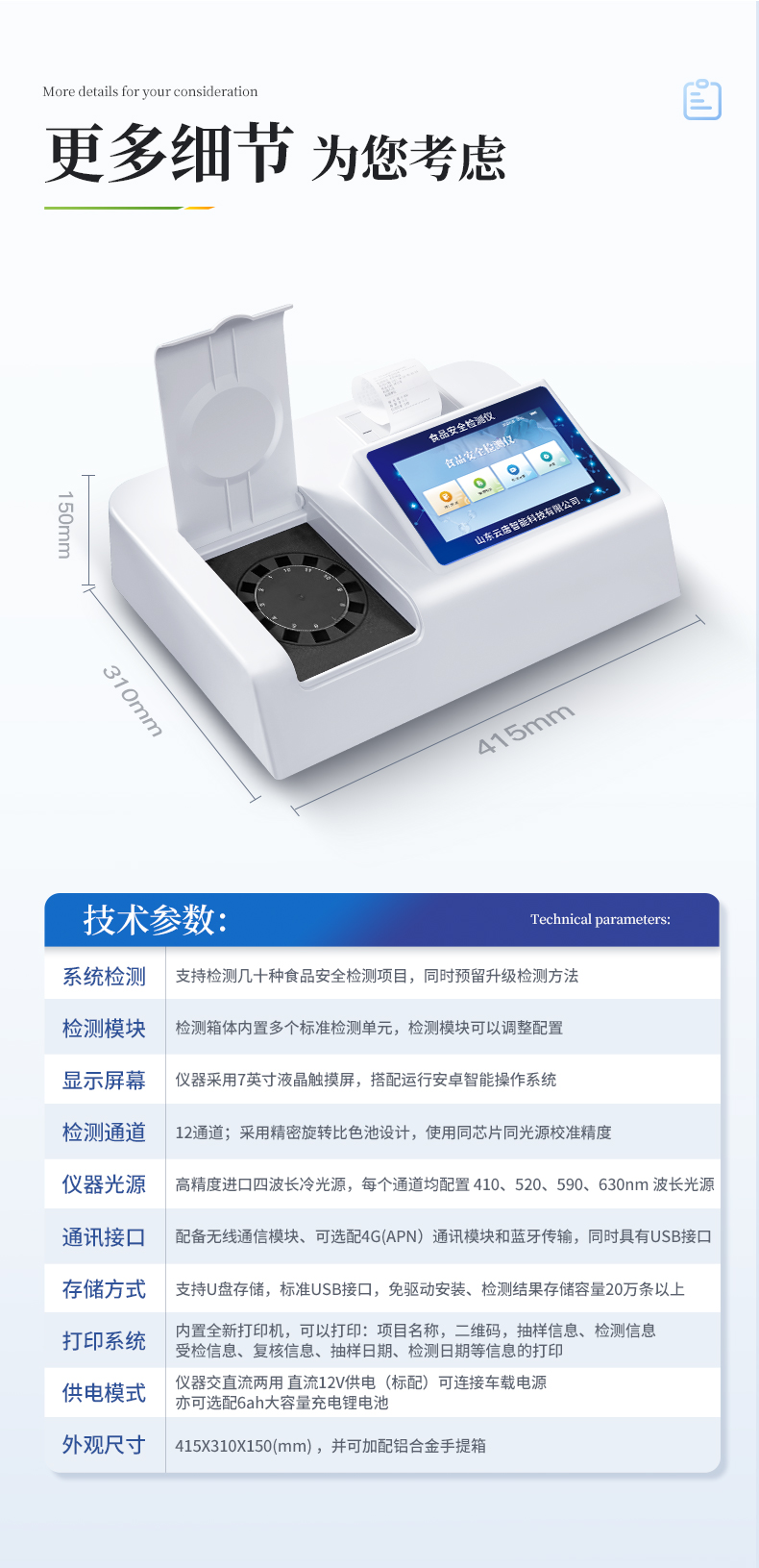 | 1、仪器采用台式一体化系统检测技术,将分光光度模块、数字化管理模块、无线通讯模块高度集成于一体,支持检测几十种食品安全检测项目,同时预留升级检测方法。 | 2、仪器检测模块标准化、智能化,检测项目可随意自由组合。检测箱体内置多个标准检测单元,检测模块可以调整配置。 | 3、显示屏幕:仪器采用7英寸液晶触摸屏,搭配运行安卓智能操作系统,主控芯片采用ARM Cortex-A7,RK3288/4核处理器,主频1.88Ghz,操作方便,性能更强。 | 4、检测通道:≥12通道;采用精密旋转比色池设计,使用同芯片同光源校准精度,解决不同光源之间的误差值,更加准确**。 | 5、仪器光源:高精度进口四波长冷光源,每个通道均配置 410、520、590、630nm 波长光源,标配**的光路切换装置,专利光路切换功能可实现64波长,并且所有检测项目可实现所有通道同时检测。 | 6、通讯接口:配备无线通信模块、可选配4G(APN)通讯模块和蓝牙传输,同时具有USB接口,可以多方式实现数据保存及数据传输。 | 7、存储方式:支持U盘存储,标准USB接口,免驱动安装。检测结果存储容量20万条以上,可生成Excel表格进行拷贝,并具有登录保护功能。 | 8、智能化操作系统: | 8.1、操作系统:仪器可在同一检测界面自动对应相关检测通道,一次性选择1-12个样品名称,无需退出界面,节省操作时间。并可以对每个通道属性和样品信息单独进行编辑,例如送检单位、人员,检测人员等,打印时勾选打印显示。 | 8.2、限量规判系统:具有限量查询、添加物质合规判定系统。检测出结果后,系统自动调用系统数据库中相关国标进行比对判定,客观显示结果是否合格。 | 8.3、数据监管系统:同步对接监管平台,数据可局域网和互联网数据上传,检测结果可选择直接传至食品安全监管平台。进行区域食品安全监管及大数据分析处理与数据统计,检测区域食品安全长短期动态,达到食品安全问题预估、预警。 | 8.4、打印系统:内置全新打印机,可以打印:项目名称,二维码,抽样信息、检测信息,受检信息、复核信息、抽样日期、检测日期等信息的打印。 | 9、供电模式:仪器交直流两用,直流12V供电(标配),可连接车载电源,亦可选配6ah大容量充电锂电池,电量可实时显示,方便户外流动测试。 | 10、仪器具有重新校准、锁定、恢复出厂设置功能, | 11、外观尺寸:415X310X150(mm) ,并可加配铝合金手提箱 |