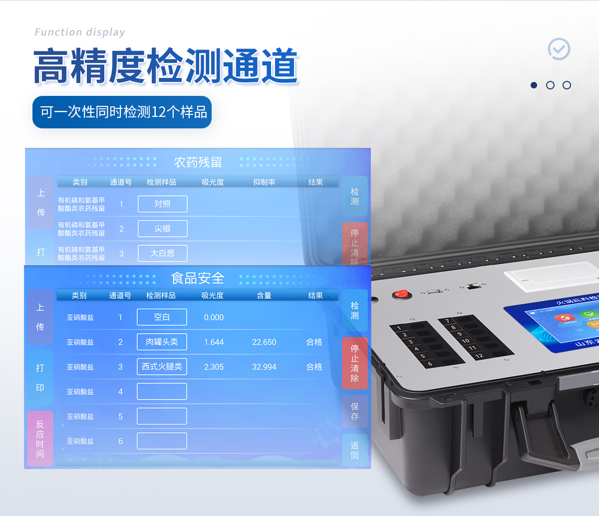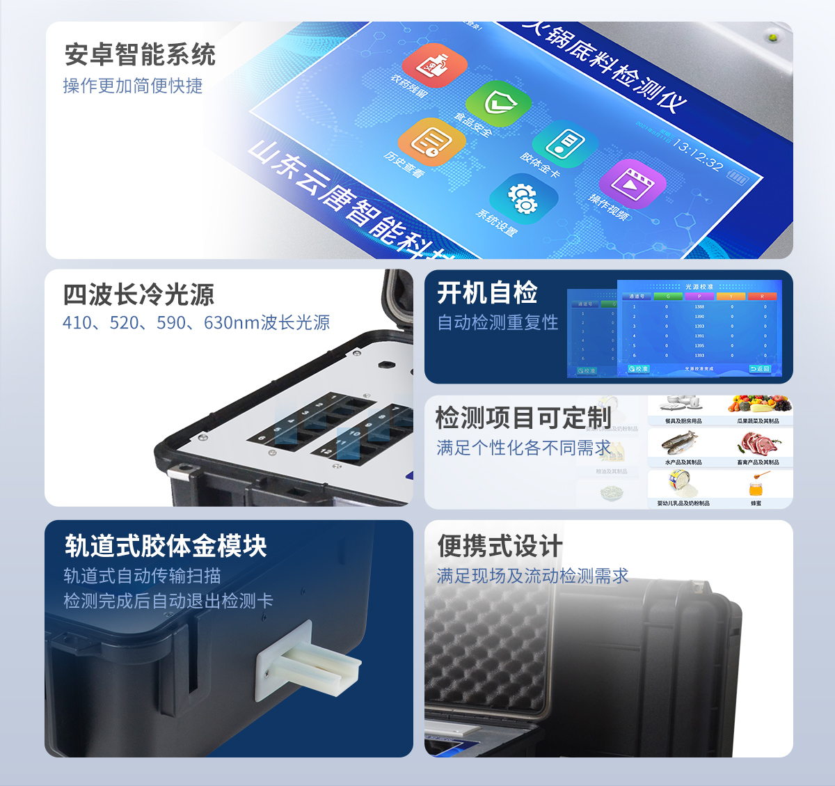 5、一体化便携式快检设备,满足现场及流动检测使用需求,能够在同一软件下实现所有检测项目的检测,并可通过同一窗口直观显示检测结果。
