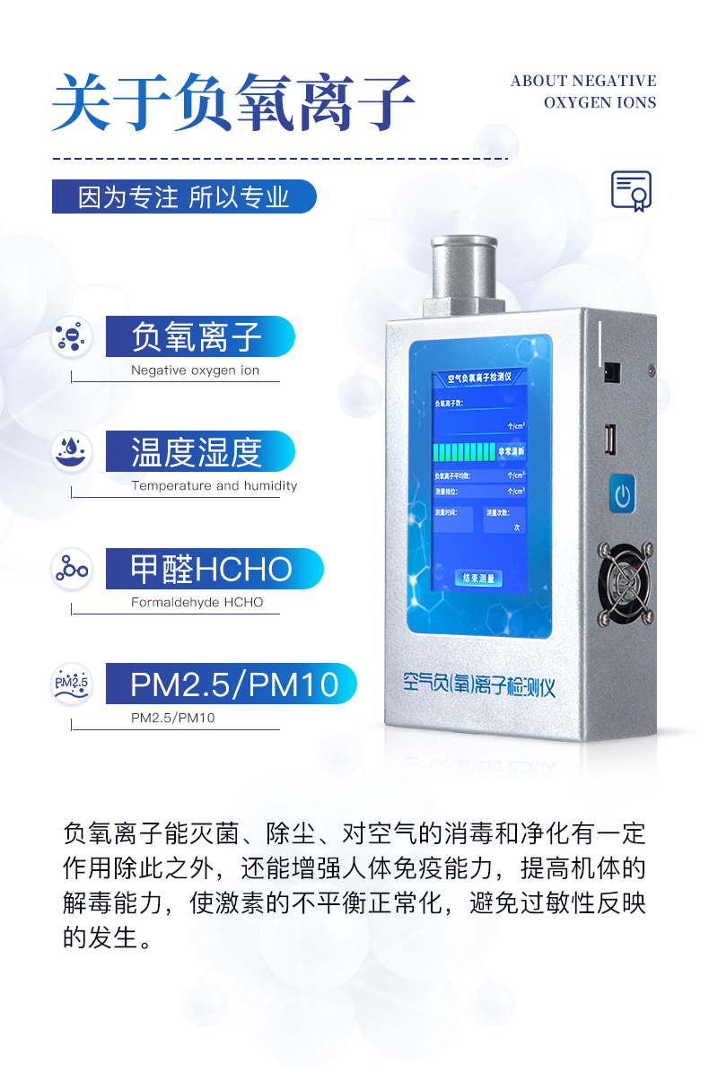 实时测量空气中的大气负氧离子浓度、甲醛浓度,是环境监测、纳米涂料、负离子保健产品、负离子家装建材、室内检测、空气治理、空气净化器及其制品负离子浓度的测量与演示的优选工具。
