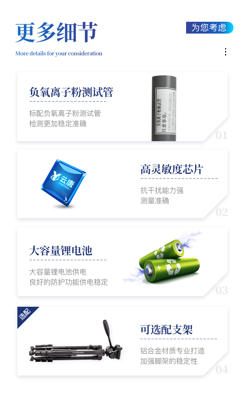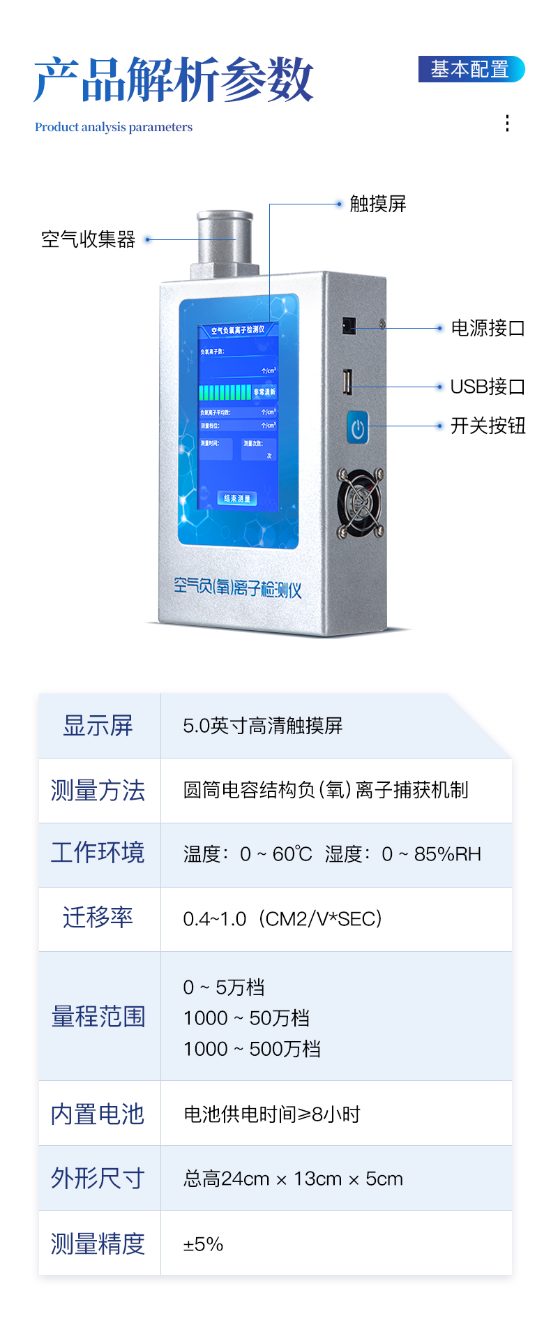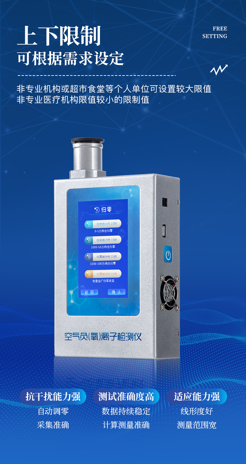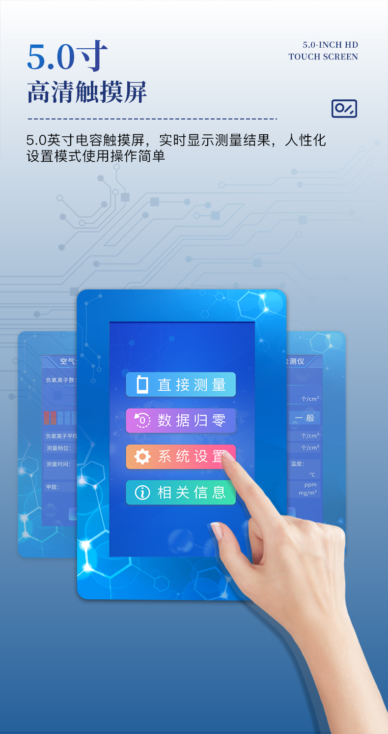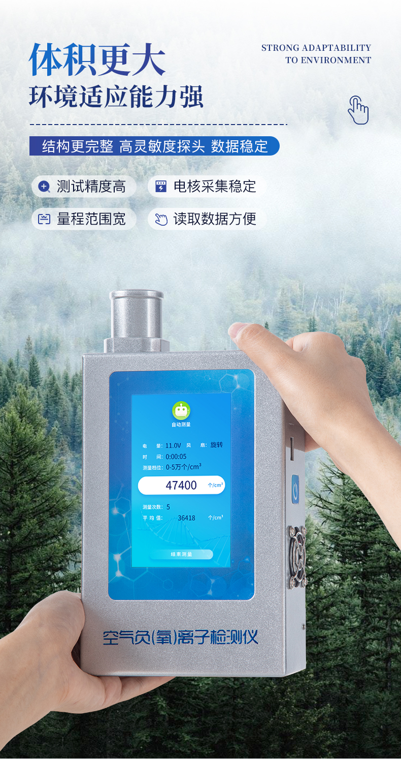 1、屏幕显示:5.0英寸电容触摸屏,800*480高分辨率,实时显示负(氧)离子测量结果;