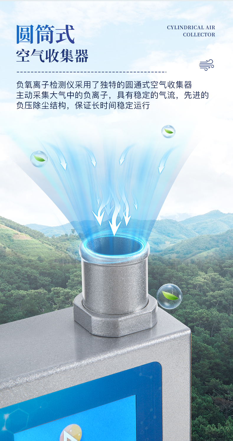 采用“电容式吸入法”原理进行负离子检测,测量空气中的负离子浓度值。在离子传感器(或称采集桶、采集筒)的极化板(或称偏压板)上加载定量的极化电压,再让被测空气按设定速度匀速通过传感器。空气中特定的小粒径负离子在电场的作用下发生偏转,被采集板所捕获。采集到的负离子负电荷量经过采集器的处理,即可计算出负离子的电荷浓度值。