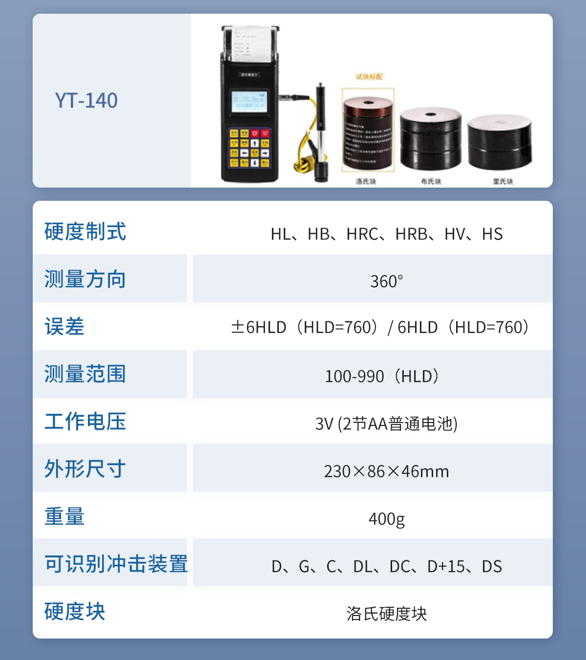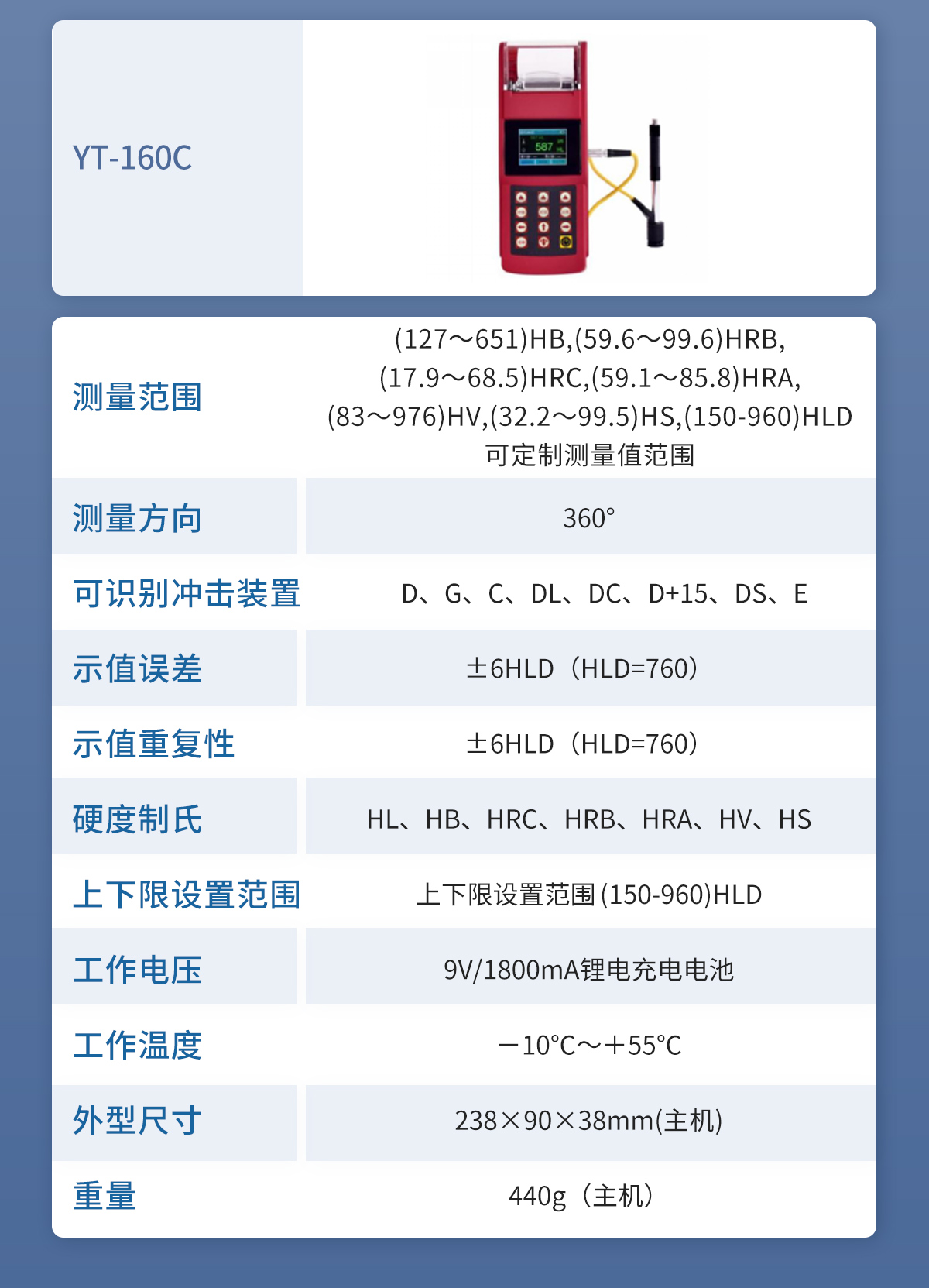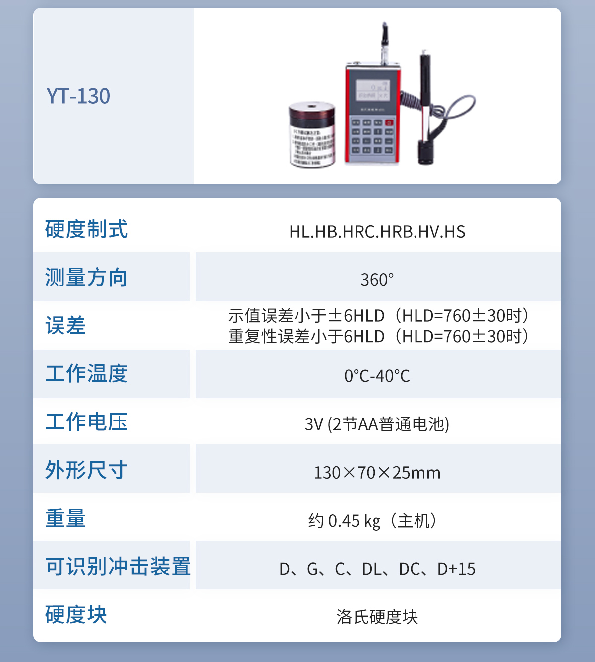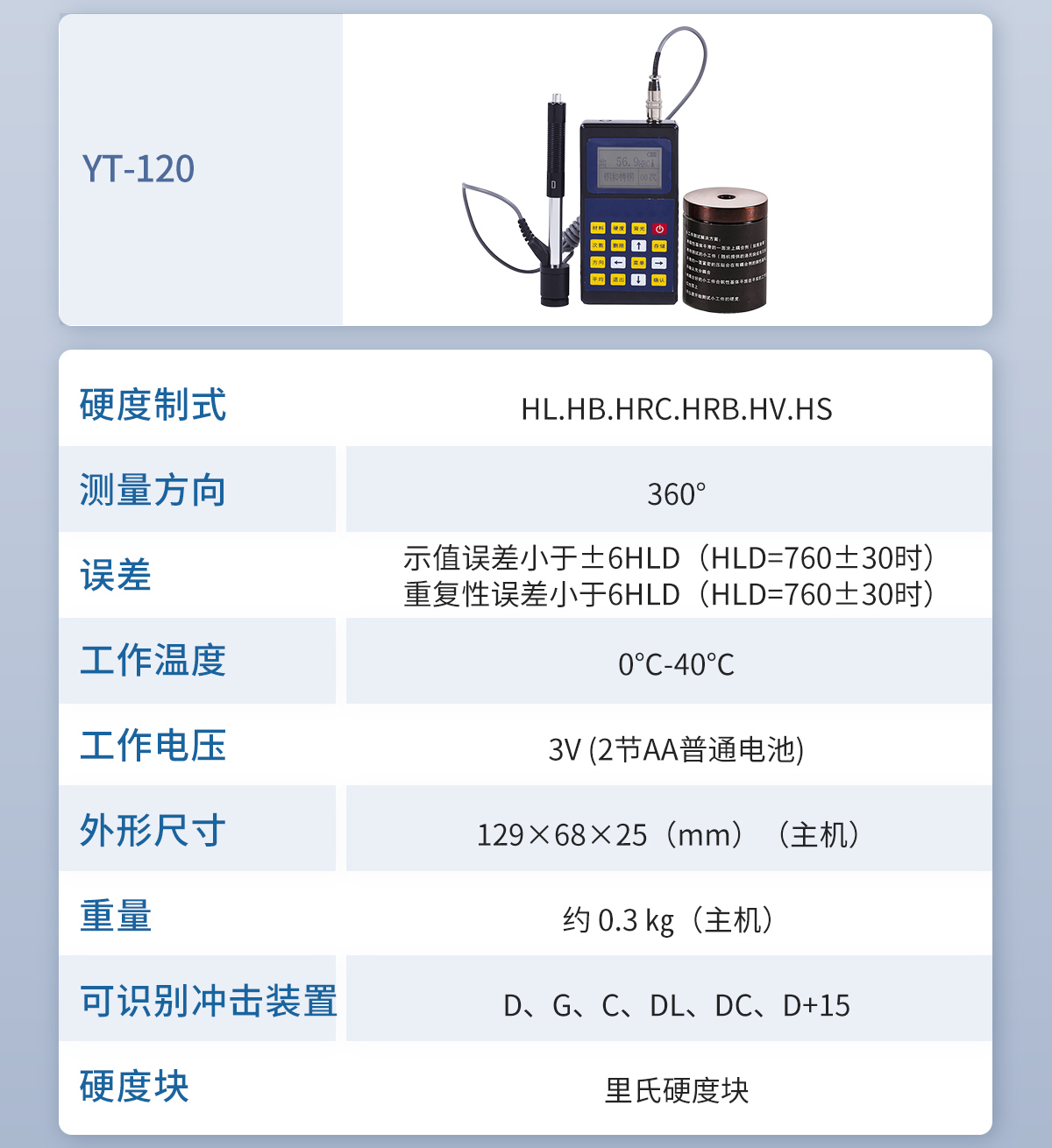 | 测量范围 | (127~651)HB,(59.6~99.6)HRB,(17.9~68.5)HRC,(59.1~85.8)HRA,(83~976)HV,(32.2~99.5)HS,(150-960)HLD,可定制测量值范围 |