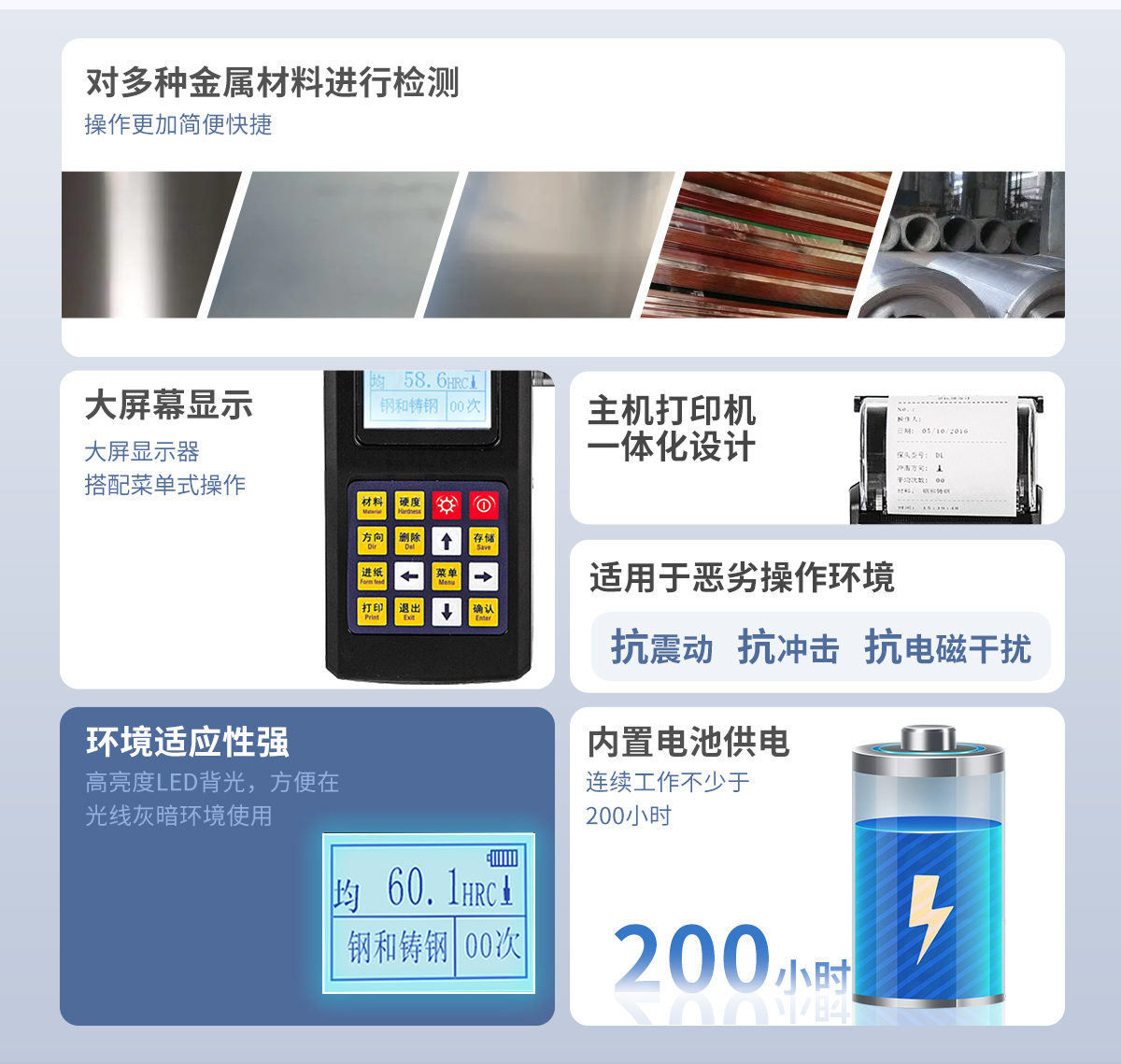 该仪器是一款集可内置打印机、公差设置等多功能为一体的硬度测量仪器,内置高速热敏打印机,支持现场即时打印,测量结果的公正性及数据的存储、可追溯性。使用全中文显示,菜单式操作,操作简单、方便。本机可直接显示里氏、布氏、洛氏、维氏、肖氏等多种硬度值。仪器小巧、便携、性价高,适用于恶劣的操作环境,抗振动、冲击和电磁干扰。