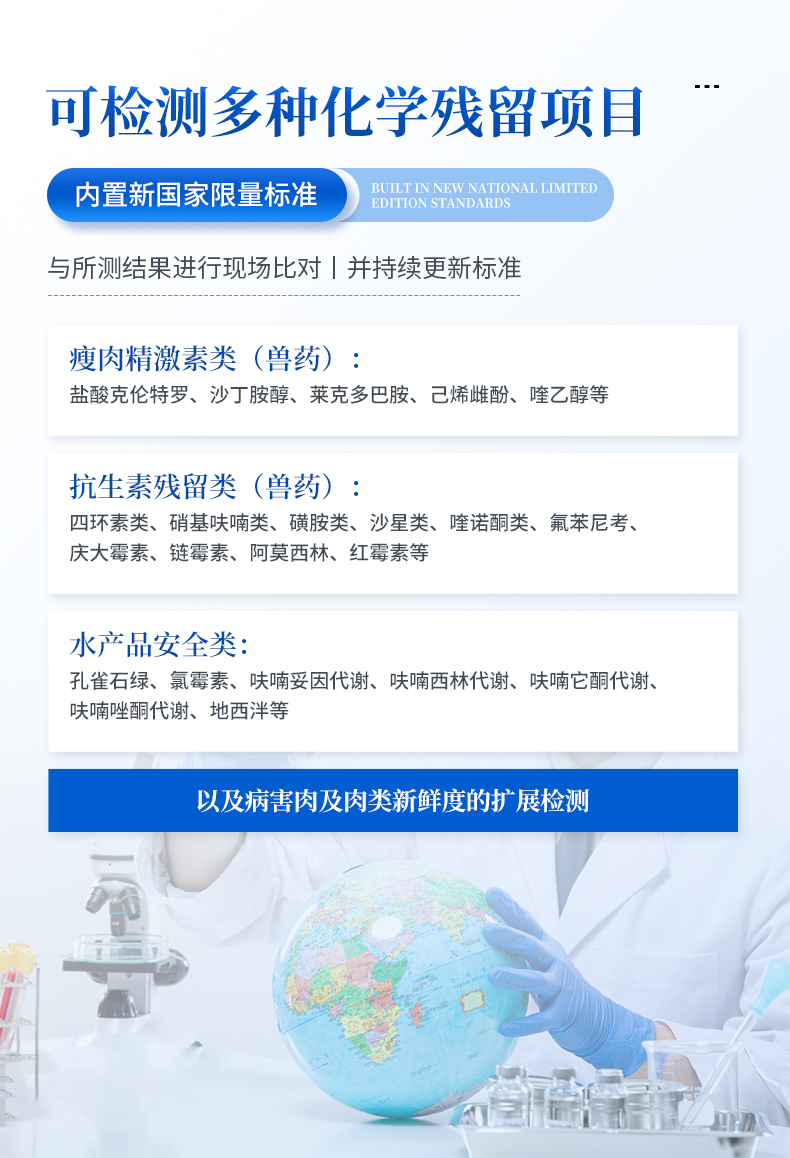 兽药(抗生素残留类):四环素类、硝基呋喃类、磺胺类、沙星类、喹诺酮类、庆大霉素、链霉素、阿莫西林、红霉素等