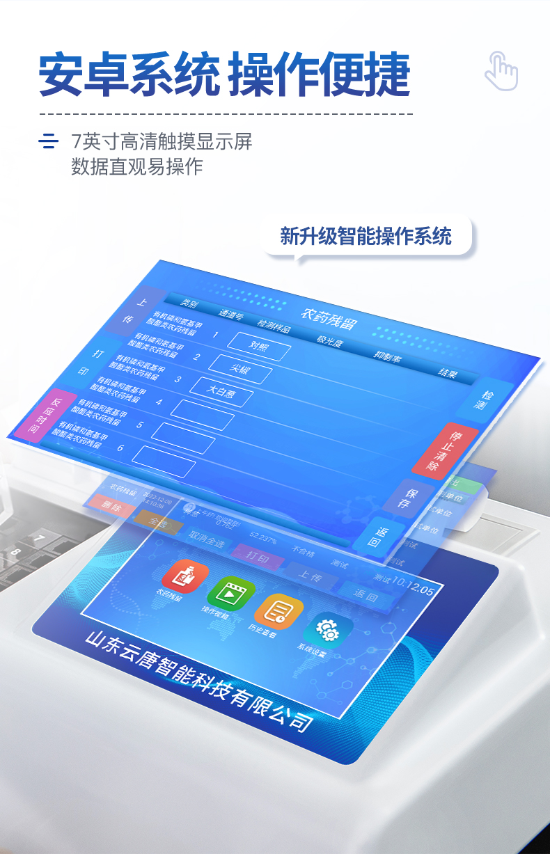 乙酰胆碱酯酶和丁酰胆碱酯酶试剂均可以使用,符合国家标准和农业部标准的要求。 自动判断样品是否合格,检测结果更加直观。仪器具有100多种蔬菜名称菜单库,分类管理,并可按需添加或删除蔬菜名,编辑蔬菜名称,可直接打印出蔬菜名称。 检测通道:12个检测通道,可以同时测试多个样品,循环检测,即放即检,每个样品由程序控制分别独立工作,不会互相干扰。智能操作系统,采用更加人性化操作,主控采用多核处理器,主频1.88Ghz,运转速度更快速,稳定性更强。 显示方式:7英寸高灵敏真彩触摸屏显示,人性化中文操作界面,读数直观、简单。打印机采用串口5v打印,可选择手动打印或者自动打印,三分钟出打印结果,打印格式为检测人姓名、吸光度差值、检测时间、检测机构、样品名称及结果判定。 光源采用进口超高亮发光二极管,具有低功耗、高精度、稳定性强、光源可控可以关掉不使用的光源,响应速度快等优点。智能恒流稳压,光强自动校准,长时间连续工作光源无温漂现象。 仪器具有GPRS远传功能,可插手机卡实现数据远传平台,wifi联网功能,可将数据快速上传电脑,进行数据管理与统计。采用USB2.0接口设计,方便数据的存贮和移动,并可随时与计算机直接相连,并且可用计算机控制仪器。实现数据查询、浏览、分析、统计、打印等。 智能化程度高,仪器具有自检功能:具有开机自检和调零功能,具有自动检测重复性功能仪器具有自身保护功能,可设置用户名及密码,防止非工作人员操作等。 采用DC12v直流供电,安全系统更高,并且配备6A锂电池充电器。仪器具有重新校准、锁定、恢复出厂设置功能。