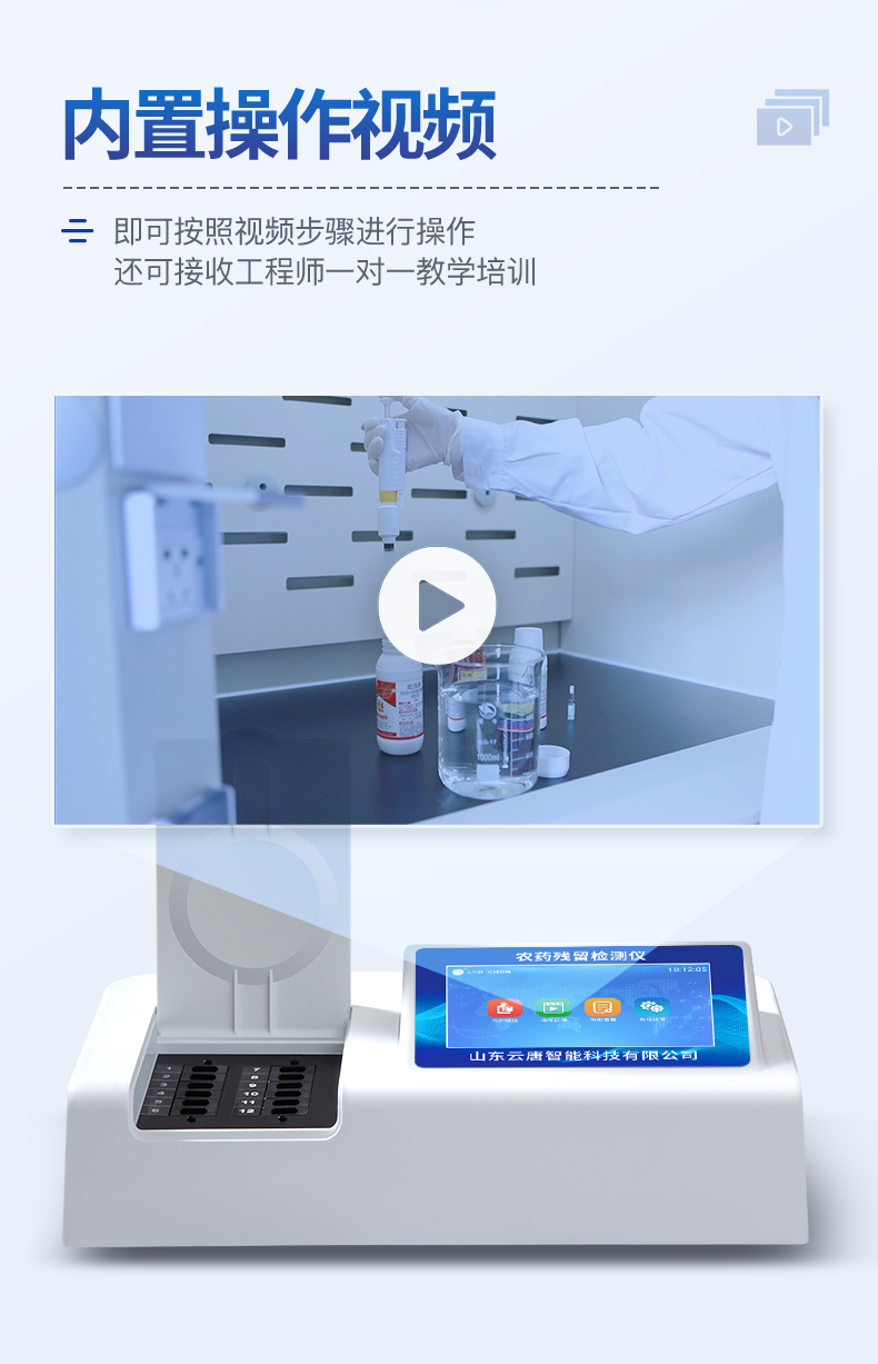 型号:发布时间:2026-03-31 一、产品简介:山东云唐智能科技有限公司生产的农药残留检测仪广泛应用于主要用于蔬菜、水果、茶叶、粮食、农副产品等食品中农药残留的快速检测,依据国标GB/T5009.199-2003进行检测,适用于果蔬茶生产基地以及农贸批发销售市场现场检测,餐馆、学校、食堂、家庭果蔬加工前的安全速测等。二、主要技术参数: 咨询热线:133 7109 8225   在线咨询   技术支持