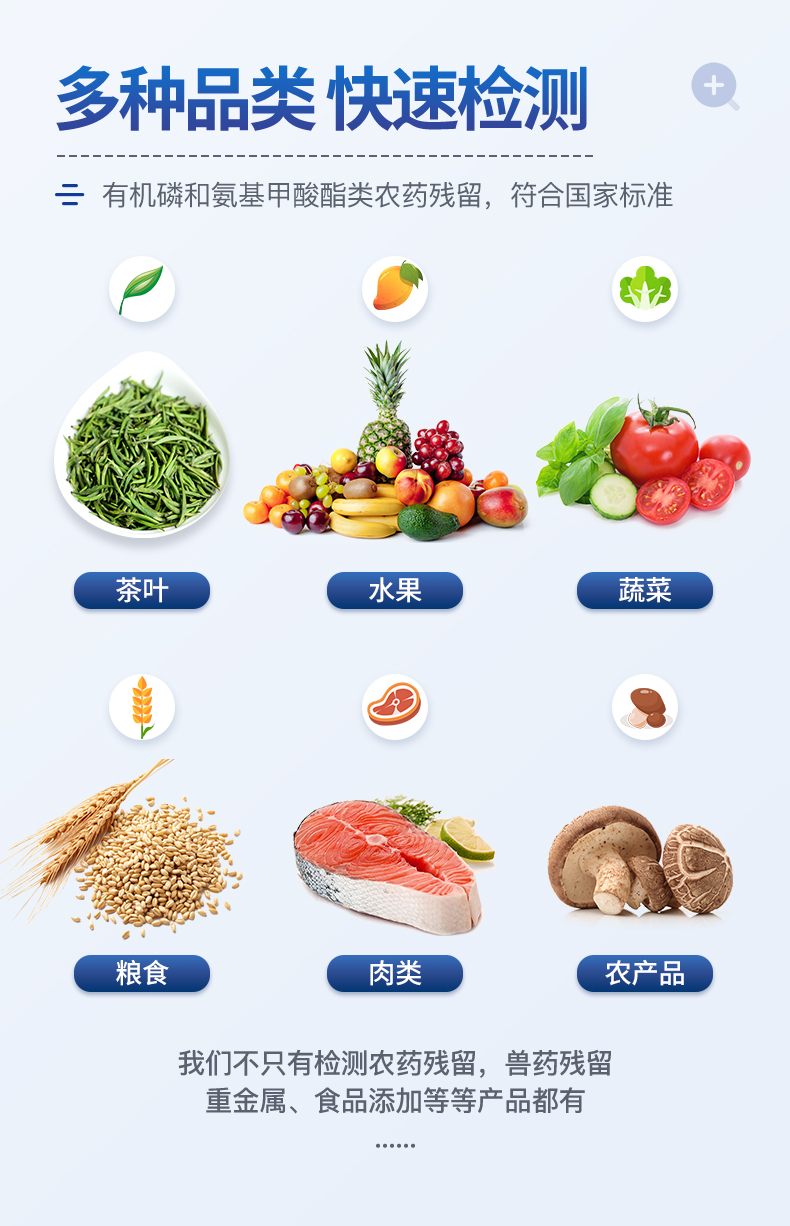 广泛应用于主要用于蔬菜、水果、茶叶、粮食、农副产品等食品中有机磷和氨基甲酸酯类农药残留的快速检测;此外还可用于果蔬茶生产基地和农贸批发销售市场现场检测,餐馆、学校、食堂、家庭果蔬加工前的安全速测等。