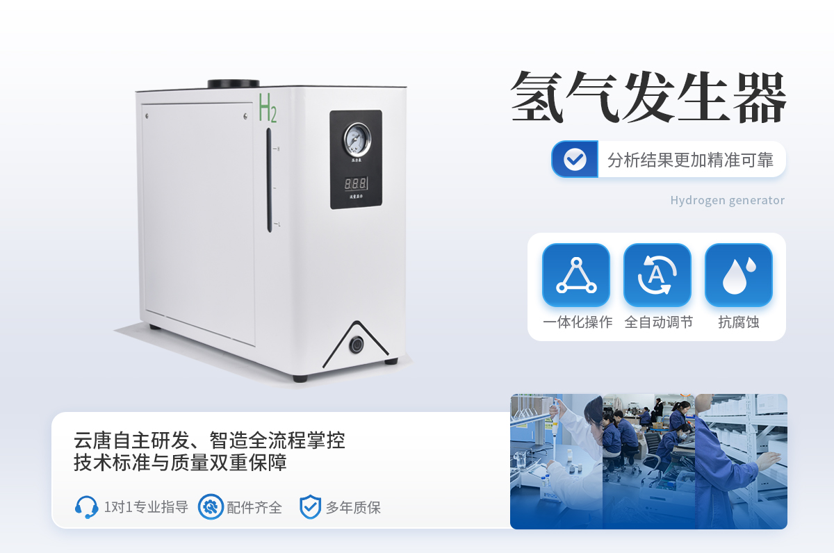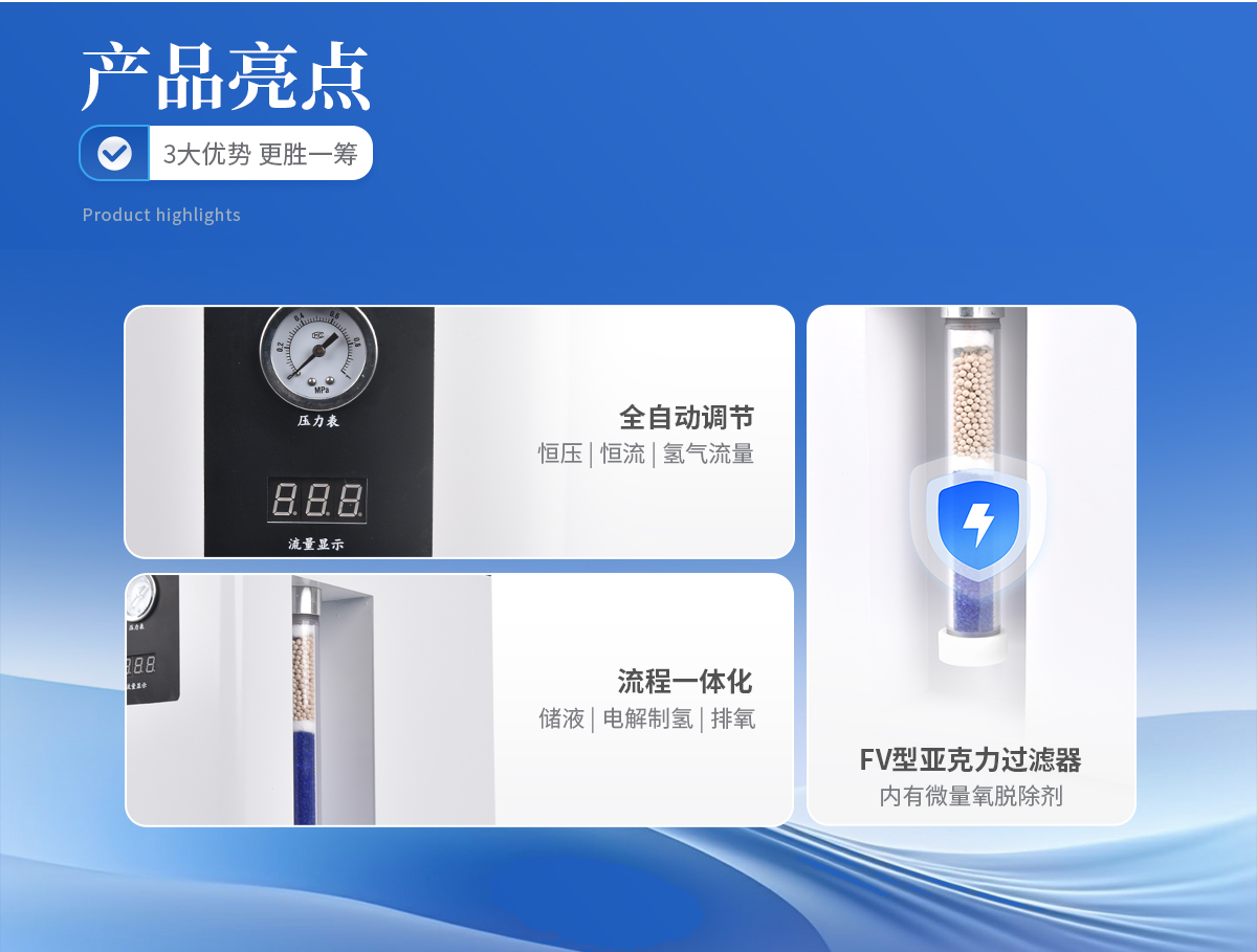 | 1、压力、流量自动显示,自动恒压、恒流、氢气流量可根据用量实现全自动调节。 | 2、FV型亚克力过滤器,内有微量氧脱除剂(不需要活化),氢气纯度更高;仪器内部采用硅橡胶圈(含硫量低),有效提高气体质量,保证色谱基线平稳。 | 3、储液、电解制氢、排氧一体化,池温低,寿命长久。 | 4、配有安全装置,灵敏可靠,自动防返碱。 |