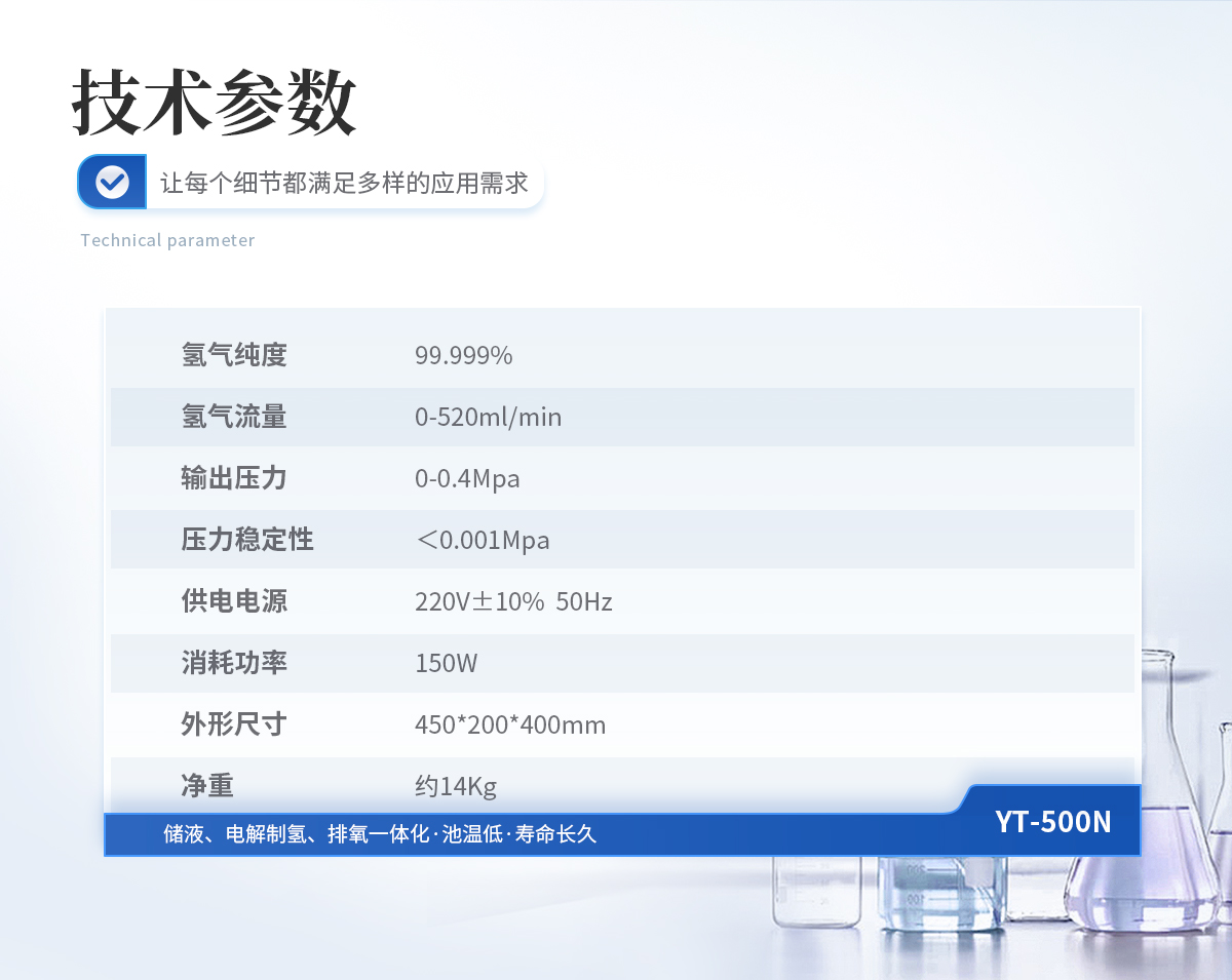 | 1、氢气纯度: 99.999% | 2、氢气流量: 0-320ml/min | 3、输出压力: 0-0.4Mpa | 4、压力稳定性:<0.001Mpa | 5、供电电源: 220V±10% 50Hz | 6、消耗功率: 120W | 7、外形尺寸: 450*200*400mm | 8、净重: 约14Kg |