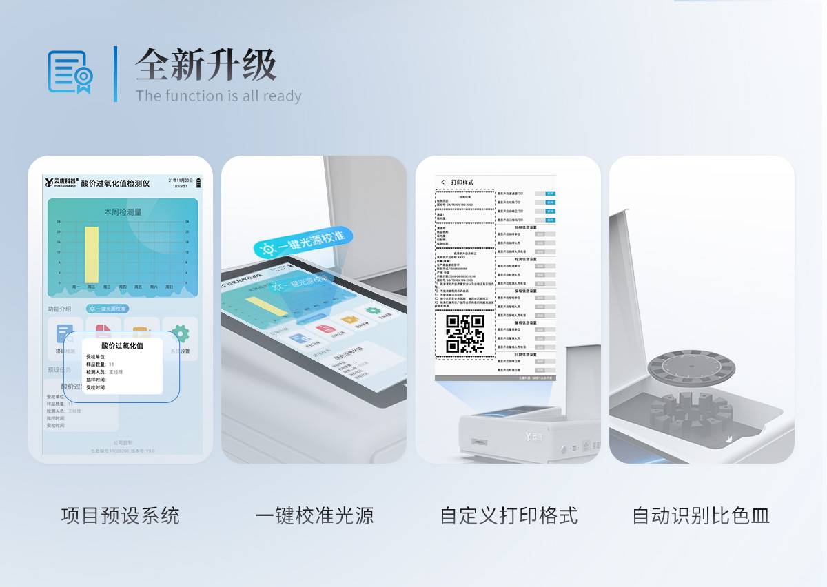 仪器采用台式一体化系统检测技术,将分光光度模块、胶体金检测模块、新型农残检测模块、数字化管理模块、无线通讯模块高度集成于一体,支持检测200种食品安全检测项目,同时预留升级检测方法。仪器检测模块标准化、智能化,可随意自由组合。检测箱体内置多个标准检测单元,检测模块可以调整配置。 仪器采用全新安卓智能系统,主控芯片采用 ARM Cortex-A7,RK3288/4核处理器,10.1寸高清液晶触摸竖屏,更加**的UI交互界面,运转快捷;仪器配备无线通信模块: 4G(APN)通讯模块、Wifi模块,蓝牙传输,同时具有双USB接口以及RJ45接口能以多种方式实现数据保存和数据传输功能。创新检测模式★检测通道:≥12通道;采用精密旋转比色池设计,使用同芯片同光源校准精度,解决不同光源之间的误差值。1-12通道间误差0.1%。(***:**202022821055.2) ★仪器具有自动识别比色皿检测功能,即:将样品比色皿放入仪器后,点击样品检测,仪器自动识别比色皿进行通道检测。进口高精光源:高精度进口四波长冷光源,通道配置 410、520、590、630nm 波长光源,一个光源芯片驱动一个光源,误差极小,每台设备单独**校准光源,**比对,同时参照四种不同波段光源全方位覆盖市面上99%的农残食品项目检测。胶体金模块检测方式:★采用COMS实时成像技术,可采集多个画面,支持2个金标同时读卡,通过不同颜色的灰度变化,一秒精准得出结果。智能操作分析系统:★便捷操作系统:设备检测时可在同一检测界面自动对应相关检测通道一次性选择1-12个样品名称,无须退出界面,节省操作时间。(需提供对应证明) ★数据集成系统:设备首页自动统计检测数据包含:周检测数据、月检测数据,全部检测总数量,均包含检测总数,合格数,不合格数,以及相关柱形分析图,对各项检测数据清晰掌握,无需电脑查询,更加快捷直观。(需提供对应证明文件)★项目预设系统:支持添加单个及多个相同或不相同的任务预设,一键快速调取,每一个任务分别可以设置不同的样品、批次、编号、来源、备注、抽样信息、检测信息、受检信息、复核信息等更多信息。无缝链接平台和APP实时查看下发任务。(需提供对应证明文件)★数据监管系统:同步对接监管平台,数据可局域网和互联网数据上传,检测结果可选择直接传至食品安全监管平台。集成OSS输出存储服务、区分设备定向管理应用,进行区域食品安全监管及大数据分析处理与数据统计,检测区域食品安全长短期动态,达到食品安全问题预估、预警。(需提供对应食品理化分析系统计算机软件著作权)。★ 自定义打印系统:内置全新打印系统,新创自定义打印方式,可按需灵活设置开启或关闭:产品合格证(国家农业部标准要求),二维码,抽样信息、检测信息,受检信息、复核信息、抽样日期、检测日期等信息的打印。(需提供对应证明)★系统远程更新功能:可定向分客户分仪器更新系统,按照不同客户后期实际需求添加项目,无需机器返厂,即可远程实时升级全新系统,节省时间成本及避免运输造成设备损坏。仪器主机采用一体化防水、抗压、防撞击、防腐蚀箱体设计,同时配备交直流供电,可连接车载电源,可选配大容量充电锂电池,满足现场野外检测需求。安全证书,放心保障:仪器具有中国计量科学研究院校准证书,权威认证。