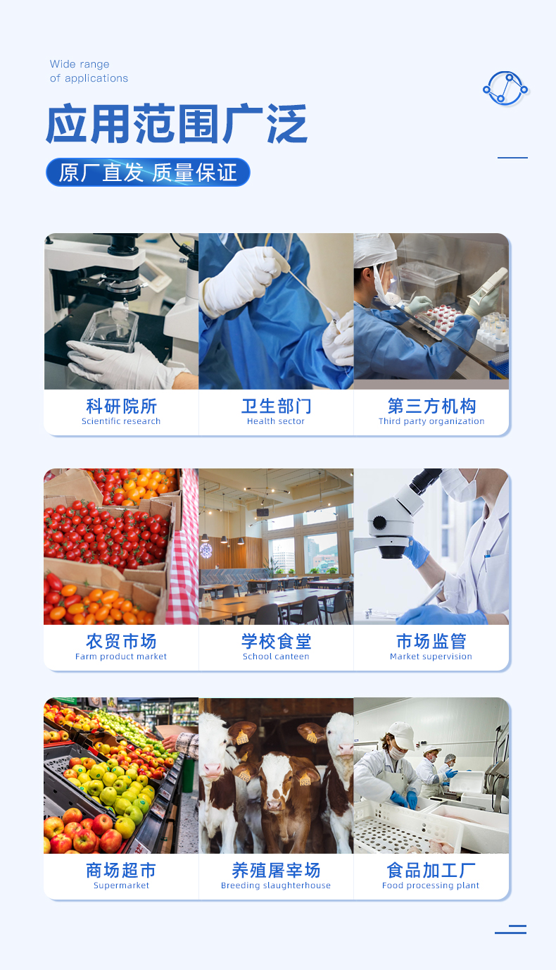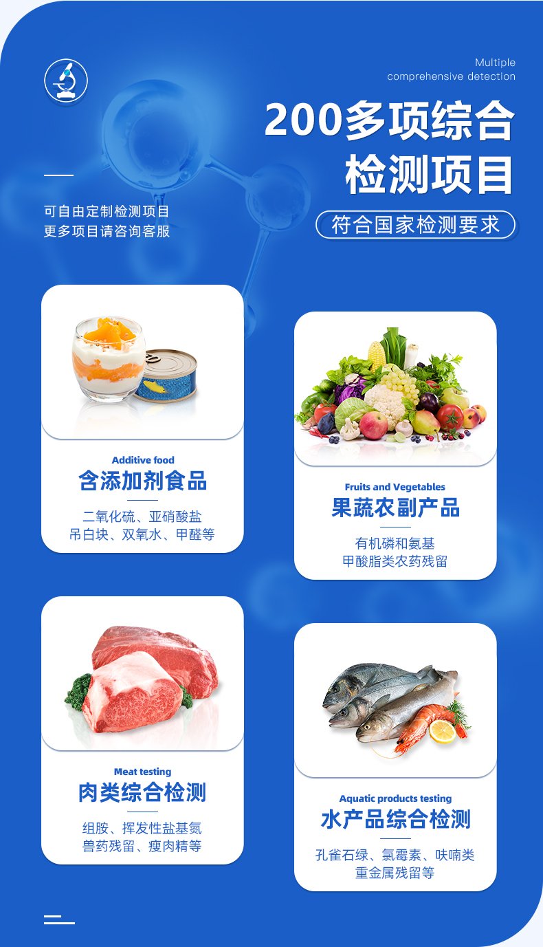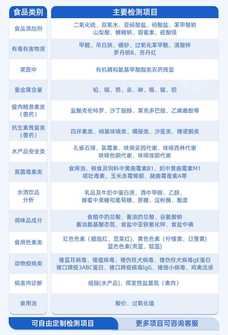 食品添加剂:二氧化硫、双氧水、亚硝酸盐、硝酸盐、苯甲酸钠、山梨酸、糖精钠、甜蜜素、安赛蜜、硫酸镁等有毒有害物质:甲醛、吊白块、硼砂、过氧化苯甲酰、溴酸钾、罗丹明B、三聚氰胺、苏丹红等瓜果蔬菜药残:农药残留(酶抑制率法)病害肉诊断:组胺、挥发性盐基氮、肉制品酸价、水发产品中组胺重金属含量:铅、镉、铬、汞、砷、锡、镍、铝等;食用油脂检测:过氧化值、酸价、油脂丙二醛等。食用油脂检测::过氧化值、酸价等瘦肉精激素类(兽药):盐酸克伦特罗、沙丁胺醇、莱克多巴胺、己烯雌酚等抗生素残留类(兽药):四环素类、硝基呋喃类、磺胺类、β-兴奋剂类、沙星类、磺胺类、喹诺酮类,甲砜霉素,氟苯尼考,金刚烷胺、替米考星、庆大霉素、林可霉素、链霉素、恩诺沙星、环丙沙星、头孢啦啶、青霉素、阿莫西林等真菌毒素类:食用油、粮食及饲料中黄曲霉毒素B1、奶中黄曲霉毒素M1、呕吐毒素、玉米赤霉烯酮、赭曲霉毒素A等水酒饮品分析:乳品及牛奶中蛋白质;酒中甲醇、乙醇、杂醇油;蜂蜜中果糖和葡萄糖、蔗糖、淀粉酶、酸度;水中氰化物、余氯,饮料中维C等调味品成分:食醋的总酸、酱油的总酸、芝麻油纯度、谷氨酸钠、酱油氨基酸态氮、食盐中亚铁氰化钾、食盐中碘等食用色素类:红色色素(胭脂红、苋菜红、赤藓红、诱惑红)、黄色色素(柠檬黄、日落黄)、蓝色色素(亮蓝)等动物疫病类:猪蓝耳病毒、猪瘟病毒、猪伪狂犬病毒、猪伪狂犬病毒gE蛋白、猪口蹄疫3ABC蛋白、猪口蹄疫病毒IgG、猪细小病毒、鸡禽流感等蜂蜜中:果糖和葡萄糖、蔗糖、淀粉酶、酸度等水产品安全类:孔雀石绿、氯霉素、呋喃妥因、呋喃西林、呋喃它酮、呋喃唑酮等