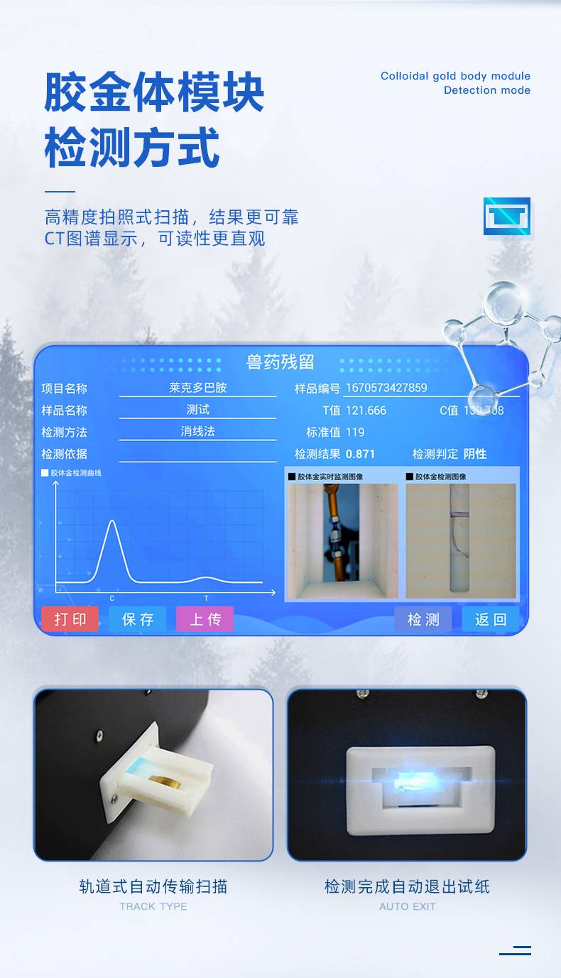 采用双通道CMOS成像处理技术及胶体金免疫层析技术,可同时读取双胶体金卡数据,自动采集、处理分析,将检测结果显示,并可根据参考限值自动判断检测结果,可检测常见的兽药残留、生物毒素、抗生素、违禁添加物等。