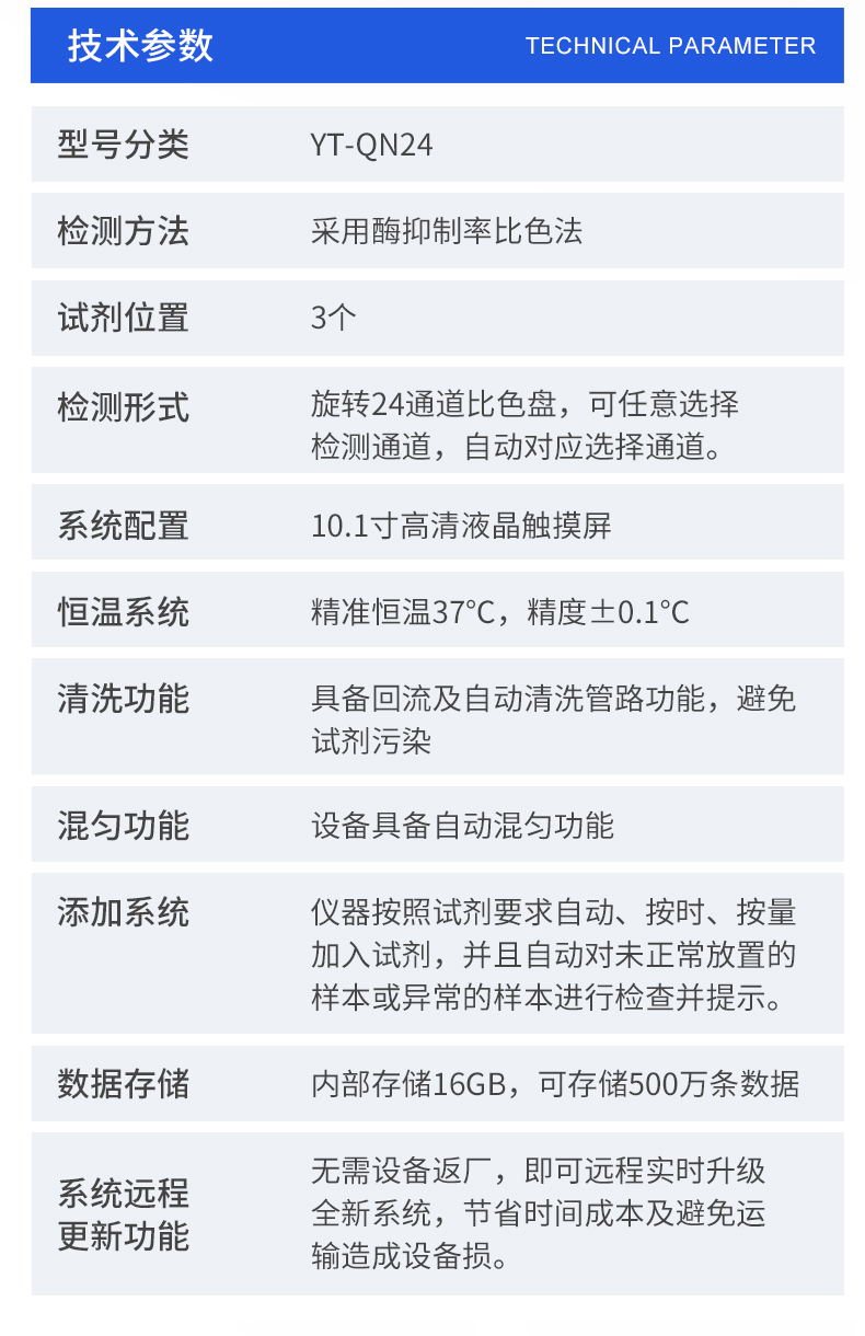 型号:YT-QN24发布时间:2026-03-31 产品介绍: 全自动农药残留检测仪是依据国家标准方法(GB/T5009.199-2003),采用酶抑制率比色法对水果、蔬菜等农产品中有机磷和氨基甲酸酯类农药含量进行快速准确的检测。该设备广泛应用于蔬菜批发市场、超市、商场、食药监等部门的蔬菜和水果中的农药残留检测。 仪器主要包括光源校准、系统设置 咨询热线:133 7109 8225   在线咨询   技术支持