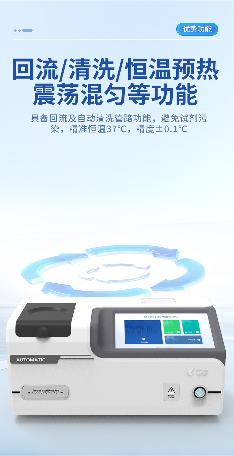 1. 试剂位置:3个 2. 检测形式:旋转24通道比色盘,可任意选择检测通道,自动对应选择通道。 3. 系统配置:10.1寸高清液晶触摸屏,采用ARM Cortex™-A7,RK3288/4核处理器,运行内存1GB。Android7.1.1 系统分辨率1280×800。 4.恒温系统:具有自动加温温控系统,精准恒温37℃,精度±0.1℃。 5.添加系统:仪器按照试剂要求自动、按时、按量加入试剂,并且自动对未正常放置的样本或异常的样本进行检查并提示。 6.清洗功能:仪器具备回流及自动清洗管路功能,避免试剂污染。 7.混匀功能:设备具备自动混匀功能。 8.光源校准:设备可自动校准,确保检测准确度。 9.实时监控:仪器测试过程中屏幕显示运行状态,可实时查看。 10.数据存储:内部存储16GB,可存储500万条数据。 11.样品多选功能:设备具备样品一键多选功能,选择样品自动匹配检测通道。 12.项目预设:可提前设置单个及多个相同或不相同的检测任务,可单次或者多次调取,减少检测时间。 13.自定义打印系统:内置自定义打印系统,可按需灵活设置开启或关闭:产品合格证(国家农业部标准),二维码,抽样信息、检测信息,受检信息等信息的打印。 14.A4版本报告打印功能:设备可自动生成A4版报告,A4报告带二维码,可扫描二维码生成电子版,并可识别真伪。 15.传输方式:仪器配备无线通信模块: 4G(APN)通讯模块、Wifi模块,蓝牙传输模块,同时具有USB接口以及RJ45接口能以多种方式实现数据保存和数据传输功能,设备数据可以同步上传至平台。 16.数据监管系统:设备自带监管平台,并可同步对接监管平台,数据可局域网和互联网数据上传,检测结果可直接传至食品安全监管平台。达到食品安全问题预估、预警。 17.系统远程更新功能:无需设备返厂,即可远程实时升级全新系统,节省时间成本及避免运输造成设备损。