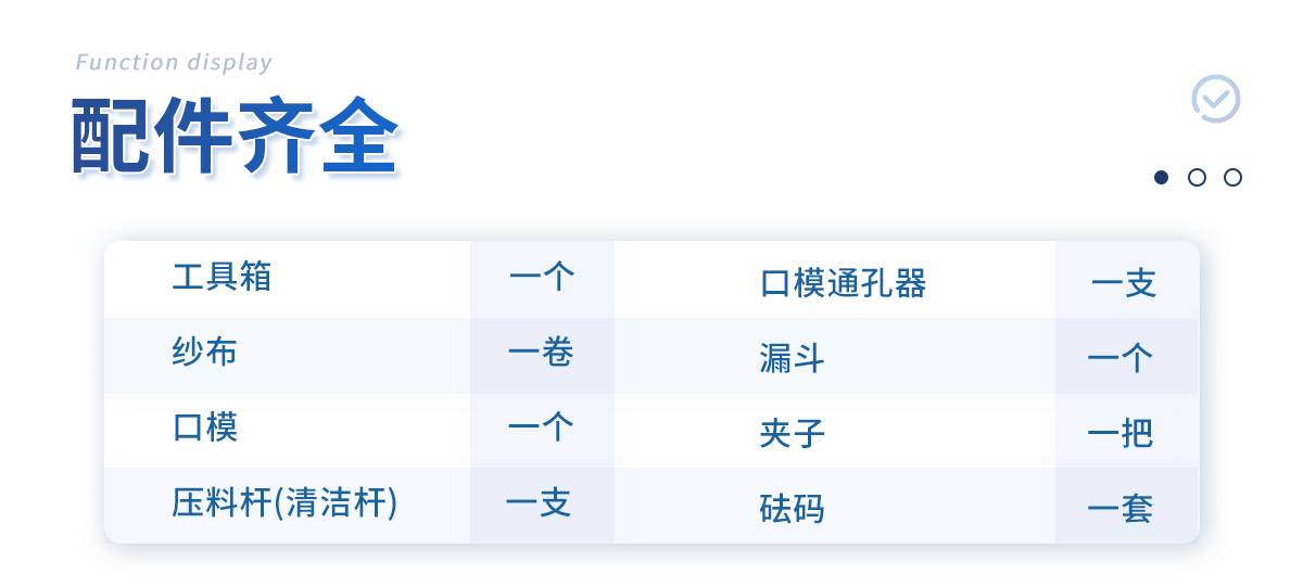 附件:工具箱一个,纱布一卷,口模一个,压料杆(清洁杆)一支、口模通孔器一支.漏斗一个.夹子一把.砝码一套.
