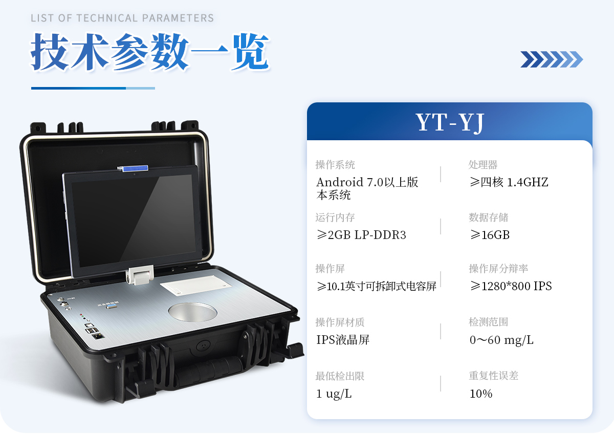 | 基本概述:便携式箱体化一体机,采用防水、抗压、防撞击、防腐蚀箱体设计,满足车载环境、无电源环境以及户外检测需求; | 主机:具备检测功能、辅助功能、管理系统软件、信息化管理功能,信息化实现数据双向传输,能直接接收管理中心下发任务,并实时上报检测结果至管理平台; | 检测技术:采用阳极溶出伏安法检测技术; | 操作系统:Android 7.0以上版本系统; | 处理器:≥四核 1.4GHZ; | 运行内存:≥2GB LP-DDR3; | 数据存储:≥16GB; | 通讯接口:包含两个USB接口、网线接口、WIFI、蓝牙、4G模块,内置GPS接口,用于户外或者其他移动检测定位; | 指示灯:具有热敏打印机工作指示灯,用于提示打印机工作状态;具有电源充电指示灯,用于提示仪器充电状态;具有无线蓝牙对接状态提示灯,用于提示操作平台与仪器主机连接状态;具有仪器工作状态提示灯,用于提示仪器主机是否处于工作状态; | 操作屏:≥10.1英寸可拆卸式电容屏设计,操作屏可以固定在仪器上,也可以取出单独操作实现运程控制; | 操作屏分辩率:≥1280*800 IPS; | 操作屏材质: IPS液晶屏; | 输入方式: 电容屏、触摸输入、支持多点触控; | 采用无汞电极,安全无毒; | 模块自带搅拌功能,启动后既可自动搅拌溶液。 | 检测范围: 0~60 mg/L ,**检出限:1 ug/L; | 重复性误差: 10%; | 具有自动寻峰功能,计算出样品**数据; | 内置线性扫描、常规脉冲扫描、微分脉冲扫描; | 仪器现场取证功能: 仪器具有800万以上防抖、自动对焦高清摄像头,对检测实样进行现场拍照取证; | 电源控制器: 双电源控制器,节省电量; | 运程控制:支持20米内无线蓝牙控制仪器检测,方便使用者没在仪器身边时也能完成项目检测; | 打印: 内置微型热敏打印机,可随时打印检测结果; | 电池:内置大容量可充电锂电池,可连续工作5小时以上; | 箱体: 便携一体化手提箱,箱体能防水,抗压,整机重量小于5kg,携带方便; |