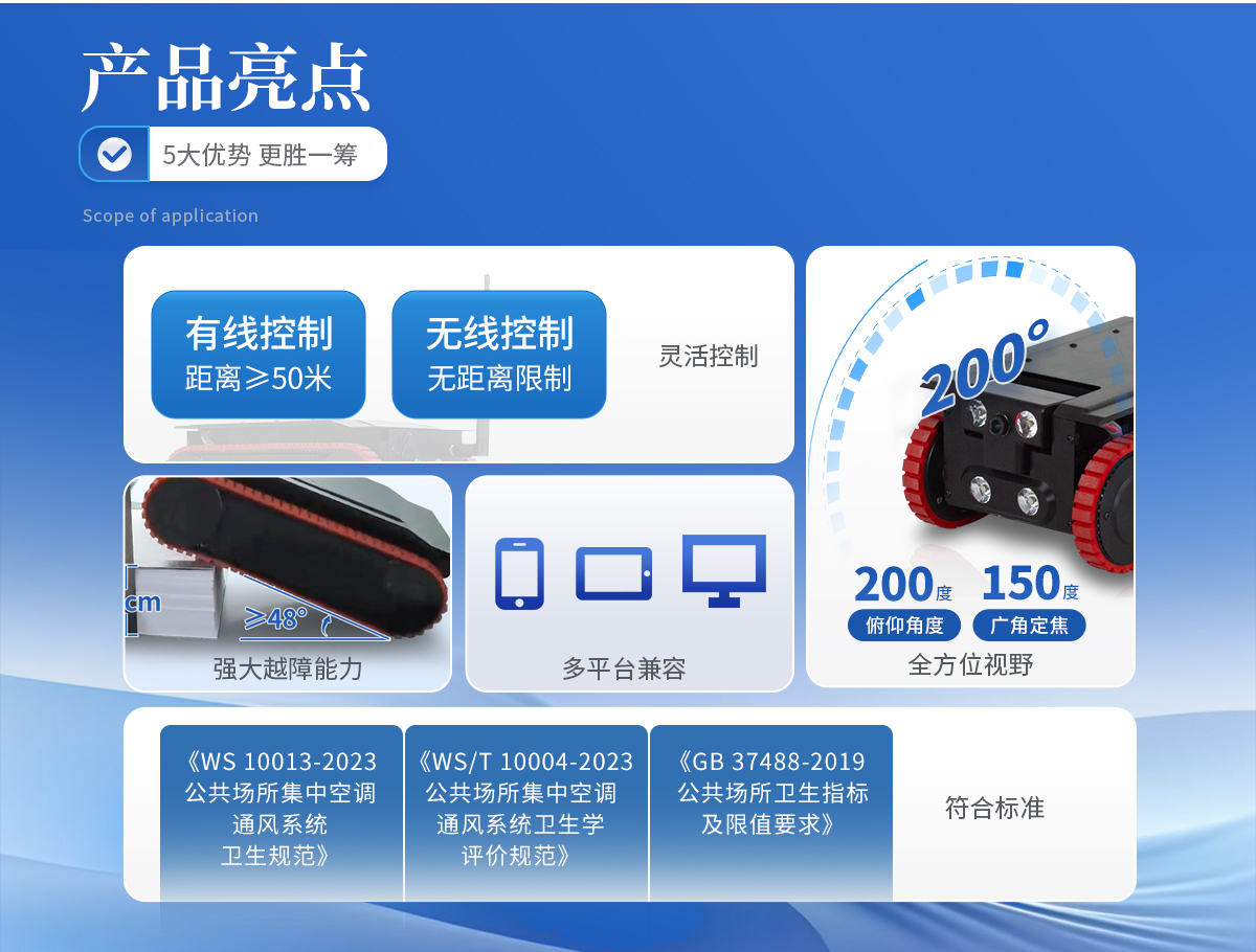 定量采样机器人是一款专为公共场所集中空调通风系统内部采样设计的高精度、便携式智能设备。该产品严格按照《WS 10013-2023公共场所集中空调通风系统卫生规范》、《WS/T 10004-2023公共场所集中空调通风系统卫生学评价规范》以及《GB 37488-2019公共场所卫生指标及限值要求》中的相关标准进行设计与制造,确保了其在各种工业环境下的稳定性和可靠性。它采用了**的航空铝合金材料,结合了**的移动性能与卓越的采样技术,能够满足多种行业的通风管道检测和维护工作需求。