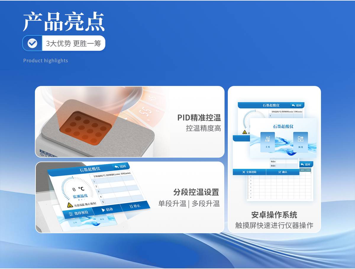 使用5寸彩色触摸屏进行仪器操作,配备安卓操作系统,方便快捷。采用PID 控温技术,控温精度高,升温速度快, 从室温到260℃仅需25分钟。分段控温设置,即可单段升温,也可多段升温,设置灵活,仪器将自动按顺序完成。更适于易产生泡沫的样品。采用优质石墨炉内芯,平均温差较小,样品效果一致性好,热传导效率更高。石墨块具有特氟龙涂层,耐腐蚀,延长使用寿命。