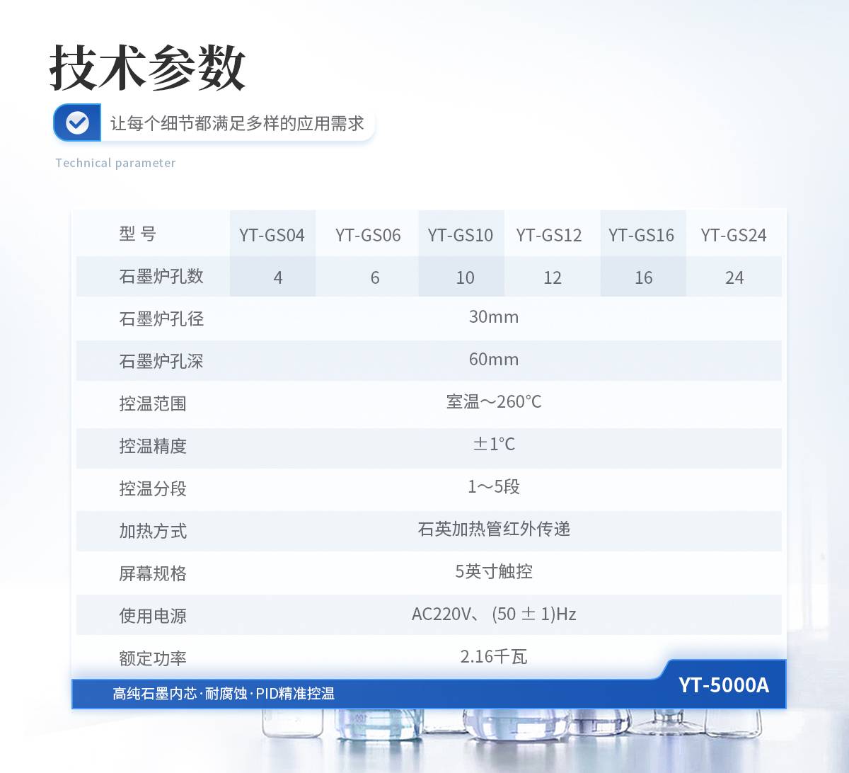 石墨炉孔:孔径30mm,孔深60mm,孔数5×2控温范围:室温~260℃控温精度:±1℃控温分段:1~5段加热方式:石英加热管红外传递屏幕规格:5寸触控主机外型尺寸:宽522mm×深371mm×高168mm使用电源:AC220V、 (50 ± 1)Hz额定功率:1.6千瓦