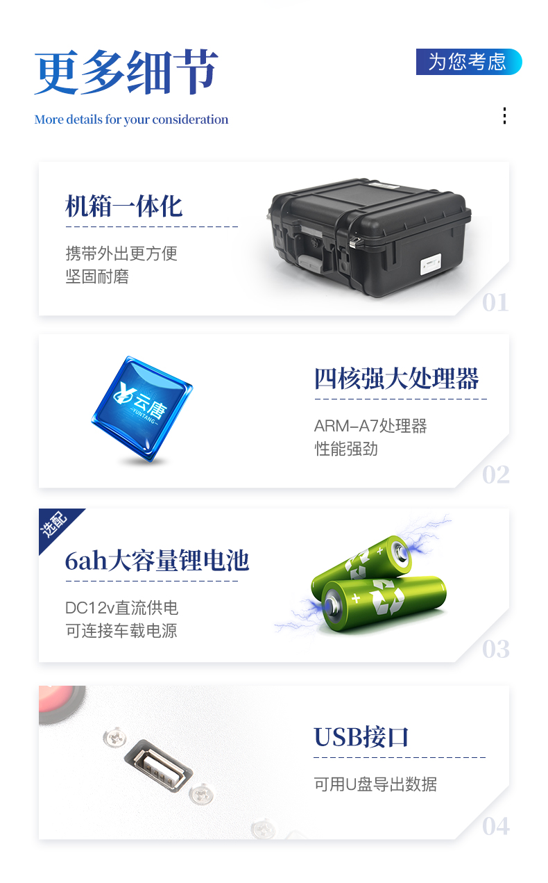 | 1、主控芯片采用ARM Cortex-A7,RK3288/4核处理器,主频1.88Ghz,运转速度更快速,稳定性更强。 | 2、显示方式:7英寸液晶触摸屏显示,人性化中文操作界面,读数直观、简单。 | 3、交直流两用,直流12V供电,可连接车载电源,可配6ah大容量充电锂电池,方便户外流动测试。。 | 4、四波长冷光源,每个通道均配置410、520、590、630nm波长光源,标配**的光路切换装置,专利光路切换功能可实现*多64波长,并且所有检测项目可实现所有通道同时检测。 | 5、光源亮度自动调节与校准 | 6、智能恒流稳压,光强自动校准,长时间连续工作光源无温漂现象。 | 7、内置新国家限量标准,与所测结果进行现场比对,并持续更新标准。 | 9、样本编号自动累加。 | 10、数据无线上传平台,并可从平台导出为Excel表格。 | 11、检测结果存储容量20万条 | 12、同时支持U盘拷贝,标准USB接口,免驱动插拔。 | 13、检测项目可扩充,固件可升级 | 14、仪器尺寸:43×35×20cm, 主机净重:5.2kg | 仪器尺寸:43×35×20cm, 主机净重:5.2kg |