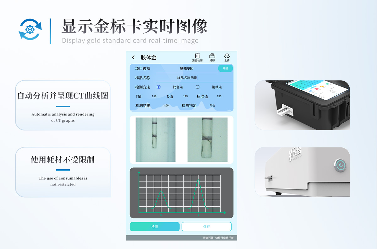 | 1、仪器采用10.1英寸液晶触摸屏显,搭配运行安卓智能操作系统,主控芯片采用ARM Cortex-A7,RK3288/4核处理器,主频1.88Ghz,运转速度更快速,性能更强。 | 2、仪器功能包括:胶体金检测模块、数字化管理模块、无线通讯模块等,可以满足同一软件下实现所有检测项目的检测,并在同一窗口展示检测结果。 | 3.一体化台式快检设备,采用交直流两用供电方式,可连接车载电源,配备6ah大容量充电锂电池,可以满足现场及流动检测使用的需求。仪器尺寸:43×35×20cm, 主机净重:5.1kg | 4、系统自带数据集成模块,设备首页自动统计检测数据包含:周检测数据、月检测数据,全部检测总数量,均包含检测总数,合格数,不合格数,以及相关柱形分析图,对各项检测数据清晰掌握,无需电脑查询,更加快捷直观。 | 5、仪器具有任务预设模块,可在样品送检前提前预设样品名称、检测指标、送检单位等信息,样品送检时一键调取保存信息,检测更加方便快捷。 | 6、胶体金检测模块: | 直插式自动扫描方式,可实时显示金标卡实时图像,系统自动分析并呈现出CT曲线图,CT线自动识别,无需手动调整,完成检测后自动退出检测卡。 | 结果判定线可修改,对照值标定值可保存,断电不丢失数据。 | 兼容市场上其他胶体金卡,使用耗材不受限制,极大增强用户使用体验。 | 7、仪器检测系统拥有庞大数据库,并且构建了完善的检索、修订功能。食品库涵盖多种样品名称,可按需添加或删除、编辑样品名称;产品数据库以及历史检测记录支持一键检索功能。 | 8、系统打印自定义化,打印格式多样化,产品合格证(国家标准要求),二维码,抽样信息、检测信息,受检信息、复核信息、抽样日期、检测日期等信息结果,可按需求自行设置打印内容。 | 9、A4纸版本报告打印功能(可选配):设备拥有两种结果展示方式,可以自动生成A4打印模板和小票打印模板两种样式,可通过WiFi及网线等方式链接外置打印机可进行打印 | 10、仪器具有 wifi 联网上传、RJ45网线连接功能,可以快速上传数据。同步对接监管平台,数据可局域网和互联网数据上传,检测结果直接传至食品安全监管平台。进行区域食品安全监管及大数据分析处理与数据统计,检测区域食品安全长短期动态,达到食品安全问题预估、预警。 | 11、设备支持U盘存储,标准USB接口,免驱动安装。检测结果存储容量20万条以上,可生成Excel表格,进行一键拷贝,并具有登录保护功能,可设置用户名及密码,规范不同人员操作权限,防止非工作人员操作,并且可以进行重新校准、锁定、恢复出厂设置功能。仪器固件可升级,后期检测项目可扩充。 | 12、仪器具备远程升级功能,可定向分客户分仪器更新,开机后自动更新,并可持续性免费更新系统版本,无需像传统产品返厂更新,节省时间及人力成本并避免了物流运输返厂升级导致设备损坏的潜在风险。 |