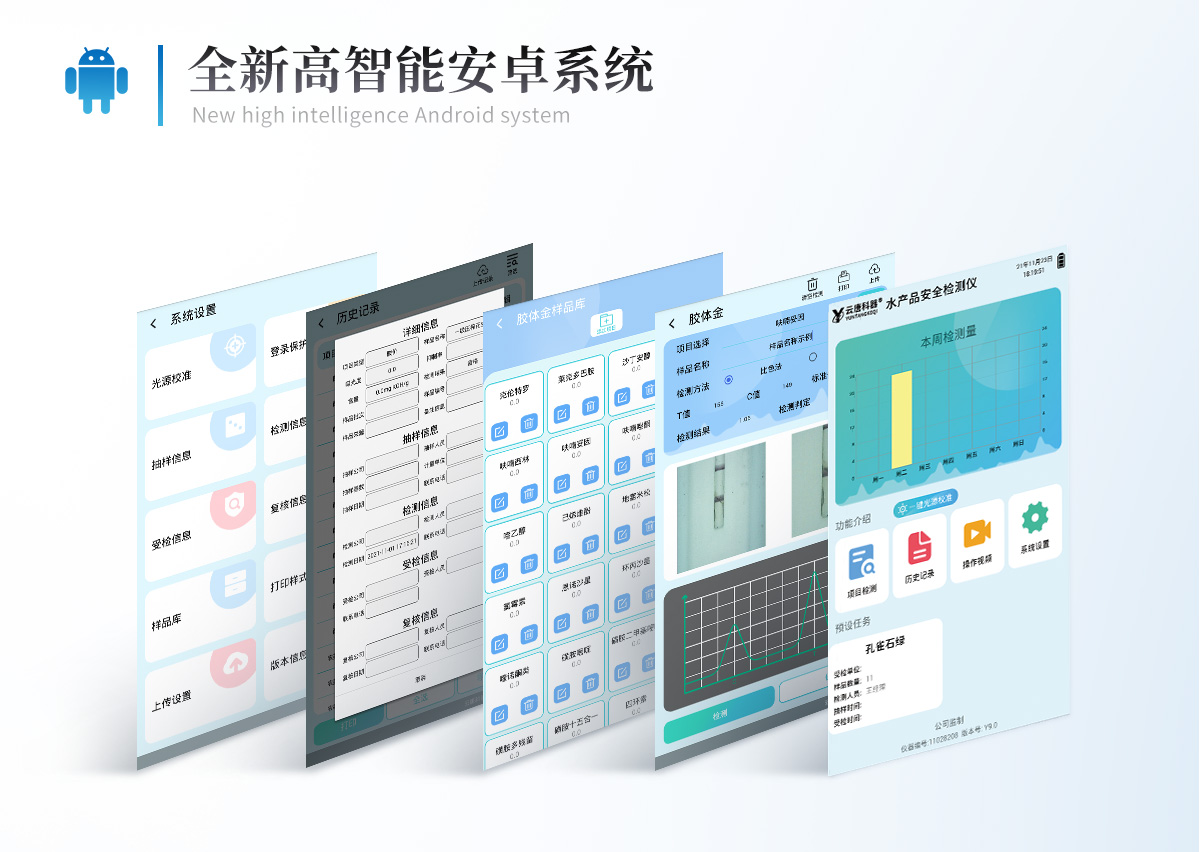 | 1、仪器采用10.1英寸液晶触摸屏显,搭配运行安卓智能操作系统,主控芯片采用ARM Cortex-A7,RK3288/4核处理器,主频1.88Ghz,运转速度更快速,性能更强。 | 2、仪器功能包括:胶体金检测模块、数字化管理模块、无线通讯模块等,可以满足同一软件下实现所有检测项目的检测,并在同一窗口展示检测结果。 | 3.一体化便携式快检设备,采用交直流两用供电方式,可连接车载电源,配备6ah大容量充电锂电池,可以满足现场及流动检测使用的需求。仪器尺寸:43×35×20cm, 主机净重:5.1kg | 4、系统自带数据集成模块,设备首页自动统计检测数据包含:周检测数据、月检测数据,全部检测总数量,均包含检测总数,合格数,不合格数,以及相关柱形分析图,对各项检测数据清晰掌握,无需电脑查询,更加快捷直观。 | 5、仪器具有任务预设模块,可在样品送检前提前预设样品名称、检测指标、送检单位等信息,样品送检时一键调取保存信息,检测更加方便快捷。 | 6、胶体金检测模块: | 轨道式自动传输扫描方式,可实时显示金标卡实时图像,系统自动分析并呈现出CT曲线图,CT线自动识别,无需手动调整,完成检测后自动退出检测卡。 | 结果判定线可修改,对照值标定值可保存,断电不丢失数据。 | 兼容市场上其他胶体金卡,使用耗材不受限制,极大增强用户使用体验。 | 7、仪器检测系统拥有庞大数据库,并且构建了完善的检索、修订功能。食品库涵盖多种样品名称,可按需添加或删除、编辑样品名称;产品数据库以及历史检测记录支持一键检索功能。 | 8、系统打印自定义化,打印格式多样化,产品合格证(国家标准要求),二维码,抽样信息、检测信息,受检信息、复核信息、抽样日期、检测日期等信息结果,可按需求自行设置打印内容。 | 9、A4纸版本报告打印功能(可选配):设备拥有两种结果展示方式,可以自动生成A4打印模板和小票打印模板两种样式,可通过WiFi及网线等方式链接外置打印机可进行打印 | 10、仪器具有 wifi 联网上传、RJ45网线连接功能,可以快速上传数据。同步对接监管平台,数据可局域网和互联网数据上传,检测结果直接传至食品安全监管平台。进行区域食品安全监管及大数据分析处理与数据统计,检测区域食品安全长短期动态,达到食品安全问题预估、预警。 | 11、设备支持U盘存储,标准USB接口,免驱动安装。检测结果存储容量20万条以上,可生成Excel表格,进行一键拷贝,并具有登录保护功能,可设置用户名及密码,规范不同人员操作权限,防止非工作人员操作,并且可以进行重新校准、锁定、恢复出厂设置功能。仪器固件可升级,后期检测项目可扩充。 | 12、仪器具备远程升级功能,可定向分客户分仪器更新,开机后自动更新,并可持续性免费更新系统版本,无需像传统产品返厂更新,节省时间及人力成本并避免了物流运输返厂升级导致设备损坏的潜在风险。 |