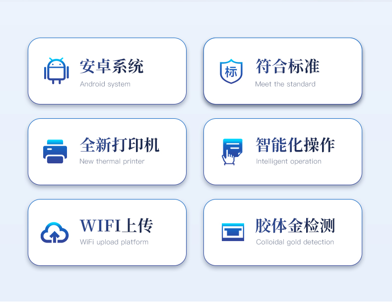 | 机箱采用工业级ABS工程塑料箱,方便携带,稳固耐用,便于流动测试。 | 安卓智能操作系统,采用更加**和人性化操作,仪器具有网线连接、wifi联网上传、4G无线远传功能,快速上传数据。 | 智能化程度高,仪器具有自检功能:具有开机自检和调零功能,具有自动检测重复性功能。 | 新一代高速热敏打印机,检测完成可自动打印检测报告和二维码。 | 仪器带有监管平台,数据可局域网和互联网数据上传,检测结果直接传至食品安全监管平台。进行区域食品安全监管及大数据分析处理与数据统计,检测区域食品安全长短期动态,达到食品安全问题预估、预警 | 一体化主机,包含食品安全检测模块、多通道农药残留检测模块、胶体金免疫层析检测模块。 | 一体化便携式快检设备,满足现场及流动检测使用需求,能够在同一软件下实现所有检测项目的检测,并可通过同一窗口直观显示检测结果。 | CT线自动识别,无需手动调整。 | 仪器具有品类多种类样品菜单库,可灵活选择检测样品,不同的检测通道可同时检测不同的样品项目。 | 样品处理简单省力,整体操作快速、安全、便捷。 | 仪器具有自身保护功能,可设置用户名及密码,防止非工作人员操作等。 | 高灵敏度,高检测精度,高重复性精度,扫描式高精度光学传感器。 | 内置强大的数据库,可在仪器上直接选择样品名称、检测指标、送检单位等信息,也可在仪器上直接编辑录入样品名称、检测指标、送检单位等信息并保存进样品数据库。 | 仪器具有重新校准、锁定、恢复出厂设置功能。 | 支持U盘存储。 结果判定线可修改,对照值标定值可保存,断电不丢失数据 | 兼容市场上所有的胶体金卡,使用耗材不受限制,极大增强用户使用体验。 |