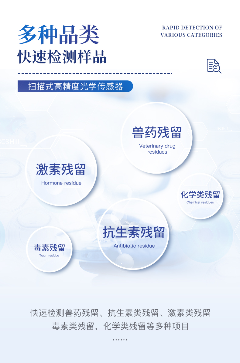 该仪器广泛应用于食药监局、卫生监督部门、农业部门、商业系统养殖场、屠宰场、食品肉产品深加工企业、畜牧兽医、检验检疫部门、食品生产企业、农副产品批发市场、农业生产基地、超市、餐厅、高教院校、食堂等单位部门对食品中的不安全指标进行监测使用。