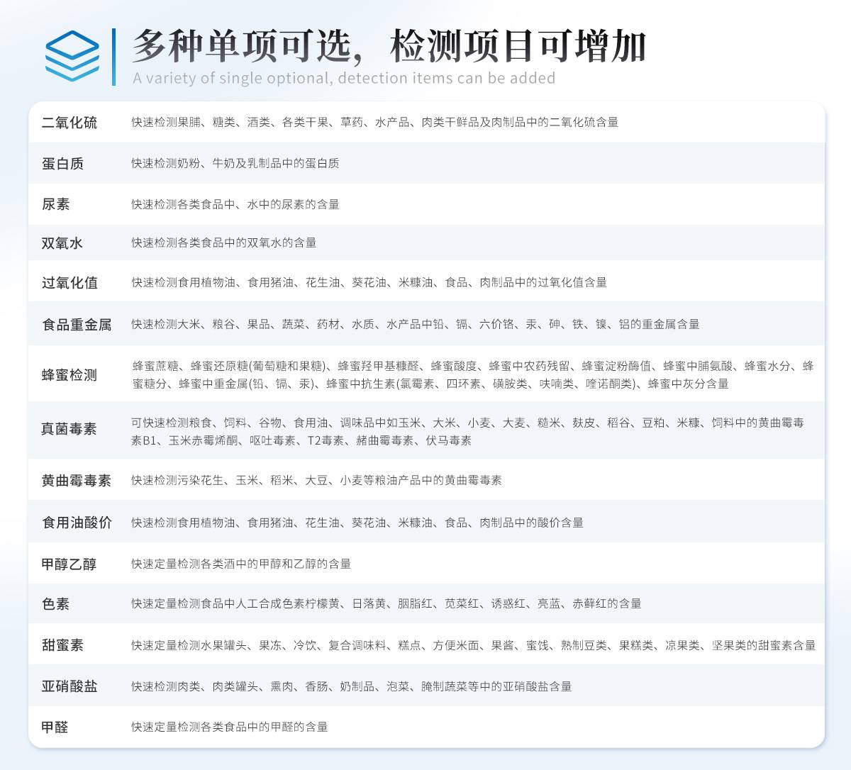 可快速定量检测各类酒中的甲醇的含量,仪器预留其他项目检测程序和端口,根据日后需求可方便的自主增加检测项目。日后可升级为检测,水产品,肉制品,面制品的综合类型仪器。