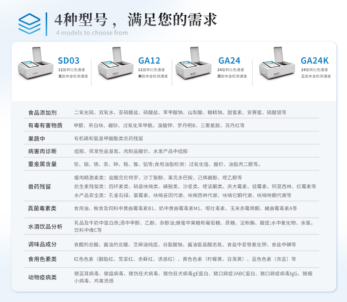 仪器采用台式一体化系统检测技术,将分光光度模块、新型农残检测模块、数字化管理模块、无线通讯模块高度集成于一体,支持检测200种食品安全检测项目,同时预留升级检测方法。仪器检测模块标准化、智能化,可随意自由组合。检测箱体内置多个标准检测单元,检测模块可以调整配置。仪器采用全新安卓智能系统,主控芯片采用 ARM Cortex-A7,RK3288/4核处理器,10.1寸高清液晶触摸竖屏,更加**的UI交互界面,运转快捷;仪器配备无线通信模块: 4G(APN)通讯模块、Wifi模块,蓝牙传输,同时具有双USB接口以及RJ45接口能以多种方式实现数据保存和数据传输功能。创新检测模式:★检测通道:≥12通道;采用精密旋转比色池设计,使用同芯片同光源校准精度,解决不同光源之间的误差值。1-12通道间误差0.1%。(***:**202022821055.2)★仪器具有自动识别比色皿检测功能,即:将样品比色皿放入仪器后,点击样品检测,仪器自动识别比色皿进行通道检测。进口高精光源:高精度进口四波长冷光源,通道配置 410、520、590、630nm 波长光源,一个光源芯片驱动一个光源,误差极小,每台设备单独**校准光源,**比对,同时参照四种不同波段光源全方位覆盖市面上99%的农残食品项目检测。智能化操作系统:便捷操作系统:设备检测时可在同一检测界面自动对应相关检测通道一次性选择1-12个样品名称,无须退出界面,节省操作时间。数据集成系统:设备首页自动统计检测数据包含:周检测数据、月检测数据,全部检测总数量,均包含检测总数,合格数,不合格数,以及相关柱形分析图,对各项检测数据清晰掌握,无需电脑查询,更加快捷直观。项目预设系统:支持添加单个及多个相同或不相同的任务预设,一键快速调取,每一个任务分别可以设置不同的样品、批次、编号、来源、备注、抽样信息、检测信息、受检信息、复核信息等更多信息。无缝链接平台和APP实时查看下发任务。数据监管系统:同步对接监管平台,数据可局域网和互联网数据上传,检测结果可选择直接传至食品安全监管平台。集成OSS输出存储服务、区分设备定向管理应用,进行区域食品安全监管及大数据分析处理与数据统计,检测区域食品安全长短期动态,达到食品安全问题预估、预警。自定义打印系统:内置全新打印系统,新创自定义打印方式,可按需灵活设置开启或关闭:产品合格证(国家农业部标准要求),二维码,抽样信息、检测信息,受检信息、复核信息、抽样日期、检测日期等信息的打印。系统远程更新功能:可定向分客户分仪器更新系统,按照不同客户后期实际需求添加项目,无需机器返厂,即可远程实时升级全新系统,节省时间成本及避免运输造成设备损坏。仪器主机采用一体化防水、抗压、防撞击、防腐蚀箱体设计,同时配备交直流供电,可连接车载电源,可选配大容量充电锂电池,满足现场野外检测需求。安全证书,放心保障:仪器具有中国计量科学研究院校准证书,权威认证。