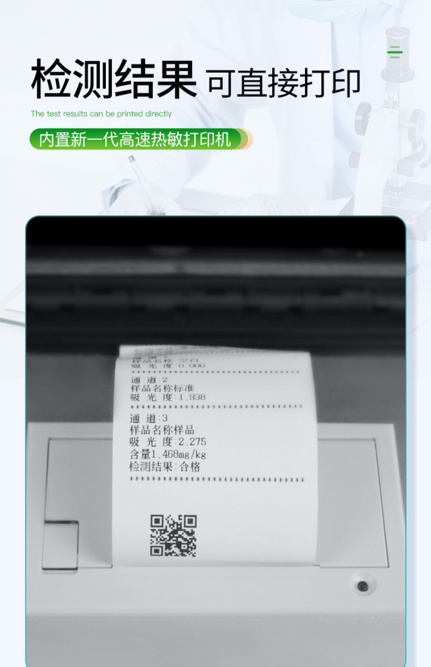13、内置新一代高速热敏打印机(无需色带),打印内容包含:检测单位、检测人员、检测项目、通道号、吸光度、重金属含量(mg/kg)、检测时间、以及二维码等信息