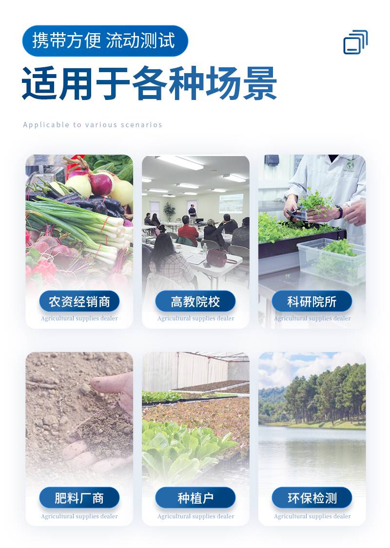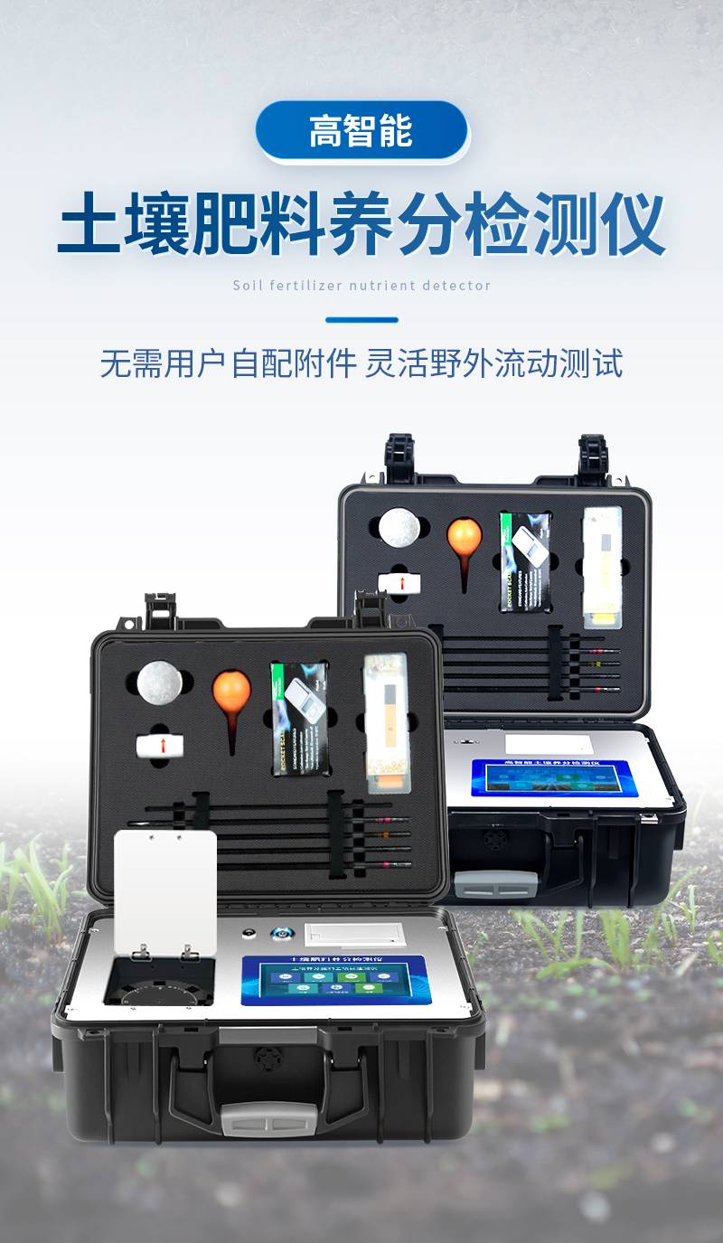 | 配套齐全:该仪器集药、器、仪为一体,携带方便,相当于一个小型移动实验室,无需用户自配附件,亦可灵活野外流动测试。适于农业服务部门或农资经销商、高教院校、科研院所、合作社、肥料厂商、大种植户测土施肥和鉴别肥料真假及环保检测应用。 | 检测功能全:测试项目国内外全面,除标配试剂外,其他各类药剂均可加配选购。 | 操作简便、速度快捷,配套整套附件及成品药剂开瓶即用,无须配置。 | 性能可靠:工作稳定性优于国家标准JJG179-90指标的6倍,重复性达到光栅型分光光度计指标水平。 |