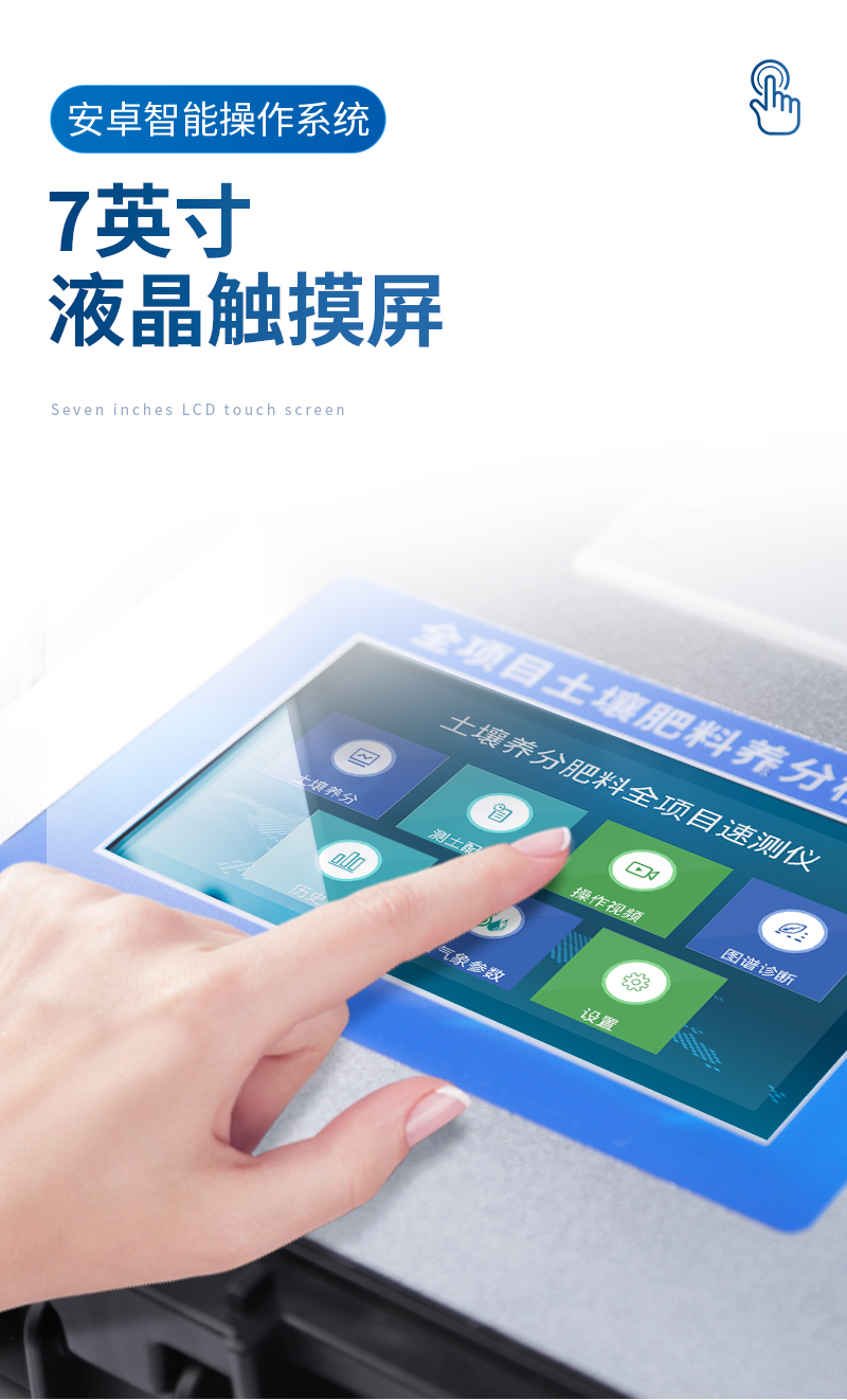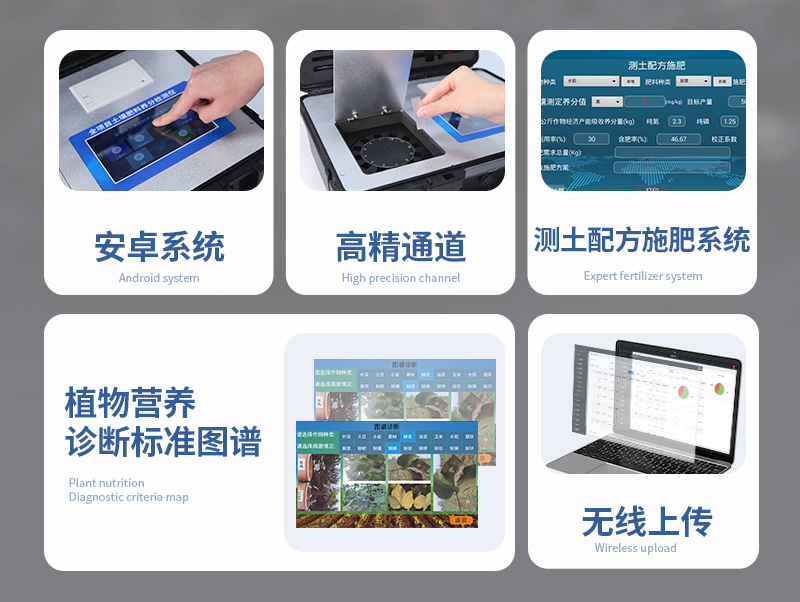 | ★1、Android安卓智能操作系统,主控芯片采用ARM Cortex-A7,RK3288/4核处理器,主频1.88Ghz,运转速度更快速,稳定性更强。 | ★2、采用精密旋转比色池设计(***:** 2018 2 1777724.7),光源一致性更加**,保证检测精度。 | ★3、12个旋转检测通道,一次性可快速检测12个样品,极大提升检测效率,降低检测成本。 | ★4、采用高精度滤光片技术自主专利分析方法(***:** 2020 2 1763837.9),权威认证。 | ★5、检测过程中内置校准功能,智能恒流稳压,光强自动校准,确保检测准确度,取得中国计量科学研究院的《校准证书》。 | 6、★内置传感器航空接口,插拔方便,配备FDR传感器、环境多要素传感器。 | 7、★FDR传感器为土壤三参数一体式,可同时测量土壤水分含量、土壤环境温度、土壤电导率(盐分)方便快捷。 | 8、★环境多要素传感器为6要素一体式,可同时测量空气温度、空气湿度、露点、大气压力、光照度、二氧化碳。 | 9、仪器标配wifi无线上传、4G联网传输、GPRS无线远传功能,快速上传数据。 | 10、配有智慧云农业平台,仪器连入无线网络后,可将检测数据可选择性或批量无线上传,方便用户进行长期数据管理和可视化分析。 | 11、仪器配同时具有USB接口、以太网接口,内置大容量内存,并可随时用U盘拷贝数据。 | 12、可用手机随时登录云平台在线移动查看历史数据 | 13、内置作物专家施肥系统,可对百余种全国农业经济作物、果树等的目标产量计算推荐施肥量,依据施肥配方科学指导农业生产。测土配方施肥结果可打印,打印内容包含:作物种类、肥料种类、目标产量、需求总量、建议施肥方案。 | 14、内置植物营养诊断标准图谱,根据各农作物营养缺失的图片,进行叶面对比,诊断丰缺。 | 15、4波长专业测试冷光源(红、蓝、绿、橙),光源波长稳定,长时间连续工作光源无温漂现象,寿命长达10万小时级别,重现性好,准确度高。 | 16、比色池部分采用标准1cm比色皿,无机械位移及磨损,光路测试定位**,有效屏蔽外光干扰,保证检测结果优于国标要求。 | 17、仪器系统内带有样品前处理操作视频,各种样品检测方法点击视频模块即可观看,检测人员无需自学说明书,指导教学方便快速,方便新手快速操作。 | 18、内置新一代高速热敏打印机(无需色带),打印内容包含:检测单位、检测人员、检测项目、通道号、吸光度、养分含量(mg/kg)、检测时间、以及二维码等信息 | 19、高灵敏7寸真彩触摸屏,采用更加**和人性化操作,高清晰高交互显示,大程度降低传统仪器的繁琐操作和失误,并取得多项《软件著作权》。 | 20、内置时钟功能,方便操作时间记录,长期历史追溯。 | 21、可设置多账户账号密码登录,**UI交互界面,不同的用户可自由添加编辑检测信息,保存后可长期使用。 | 22、GPS功能:可在野外作业时记录经纬度地点,满足特殊用户需求。 | 23、内置低电压提示功能,可在检测时明确电量,避免测试数据偏移,同时具有断电保护功能,断电自动保存数据,防止数据丢失。 | 24、交直流两用供电方式,内置大容量充电锂电池,满电状态下可连续工作10余小时,同时可外接车载电源蓄电。 | 25、仪器具有中英文切换功能,可满足出口要求。 | 26、高强度PVC工程塑料手提箱设计,坚固耐用,便于携带。 |