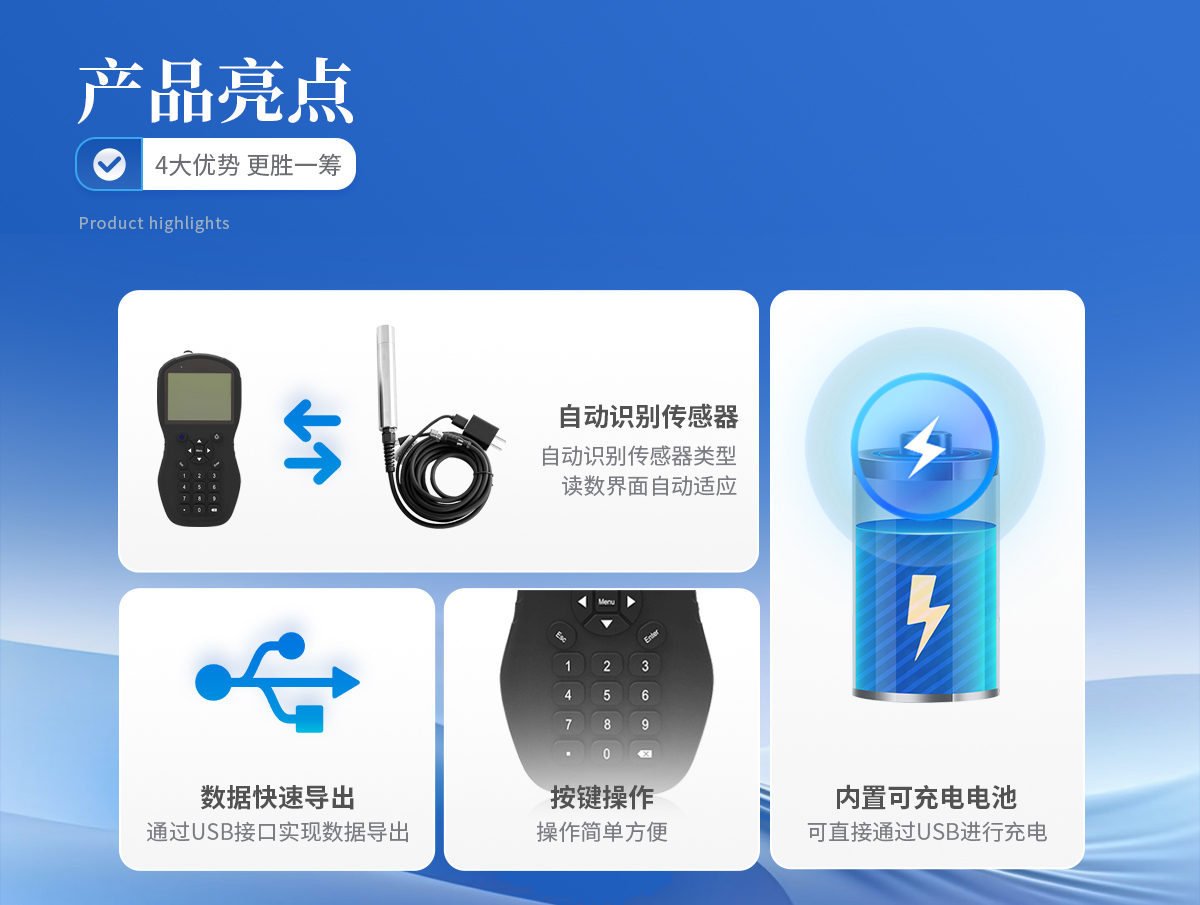 | Ø 主机具有IP67防护等级; | Ø 3.5寸彩屏显示,界面菜单设计美观,操作简单方便; | Ø 人体工程学曲线设计,适于手握握持,带有橡胶防滑手带,在潮湿环境中不易滑落; | Ø 具有数据存储功能,且可通过USB接口实现数据导出; | Ø 内置可充电电池,且直接通过USB进行充电,无需拆卸电池; | Ø 自动识别连接的传感器类型,读数界面自动适应; | Ø 可对传感器进行参数设置和校准; |
