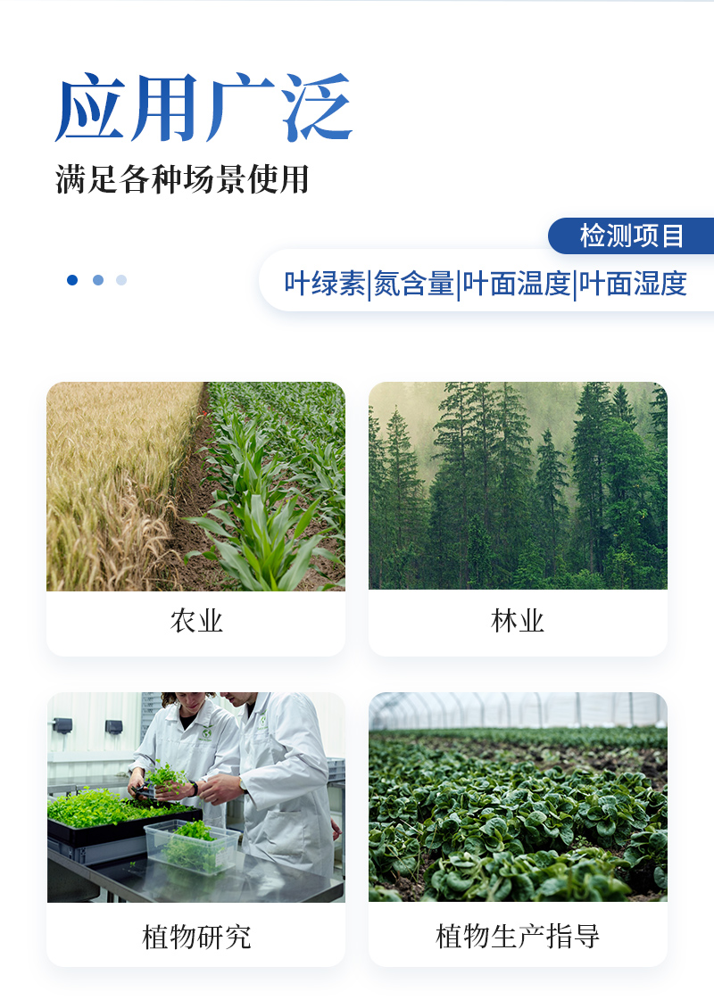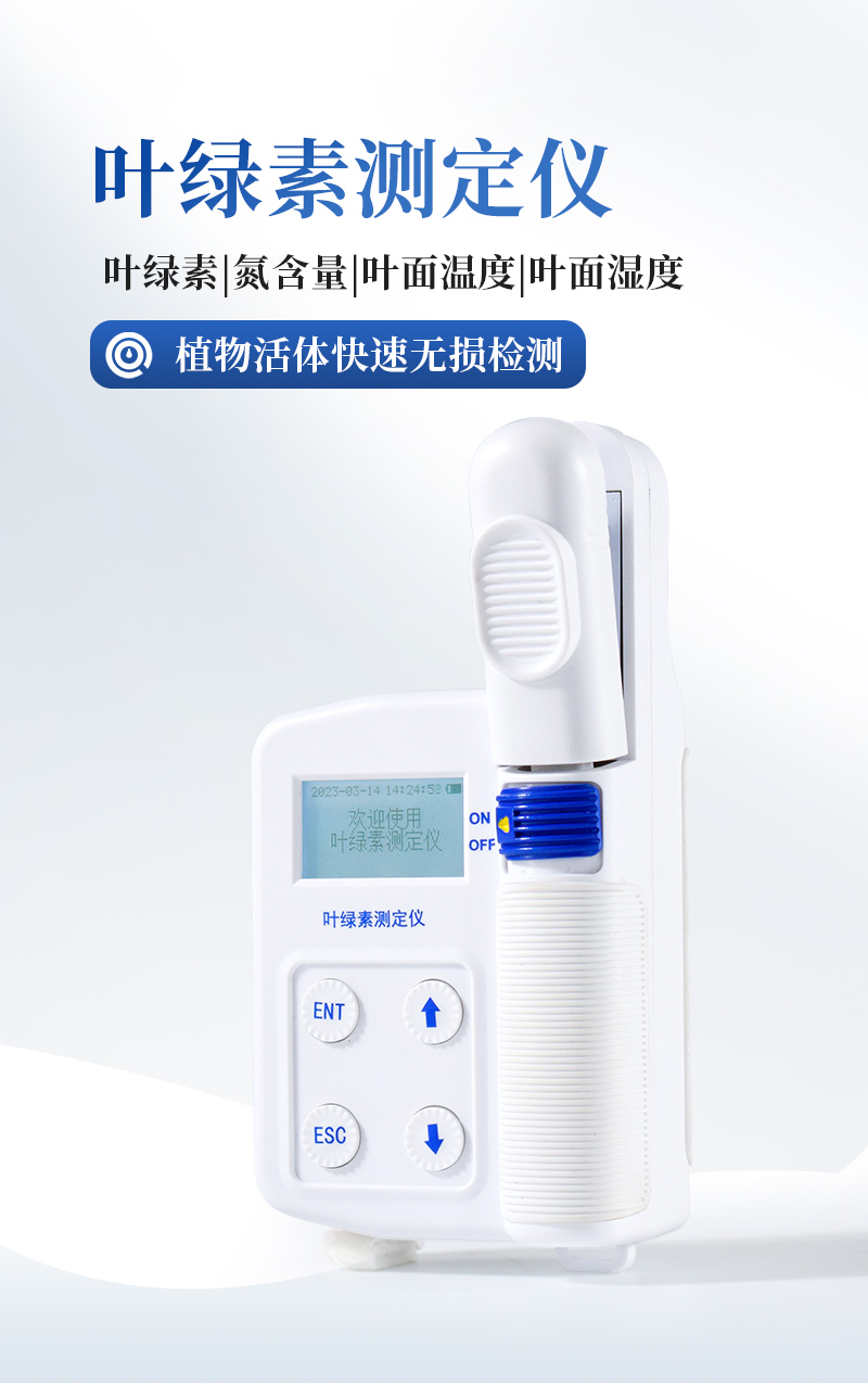 植物养分测定仪可以即时测量植物的叶绿素相对含量(单位 SPAD)或绿色程度、氮含量、叶面湿度、叶面温度,从而了解植物真实的硝基需求量并且了解土壤硝基的缺乏程度或是否过多地施加了氮肥。可以通过此款仪器来 增加氮肥的利用率,并可保护环境。可广泛应用于农林相关科研单位和高校对植物生理指标的研究和农业生产的指导。