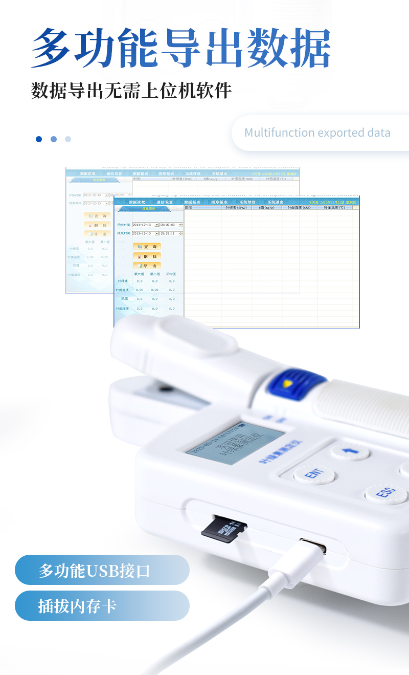 5.多功能USB接口,可实现数据导出与充电功能,可将仪器与电脑直接联机,数据导出无需上位机软件,还可选择使用内存卡直接导出数据,操作简单方便