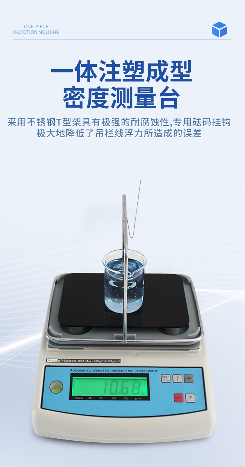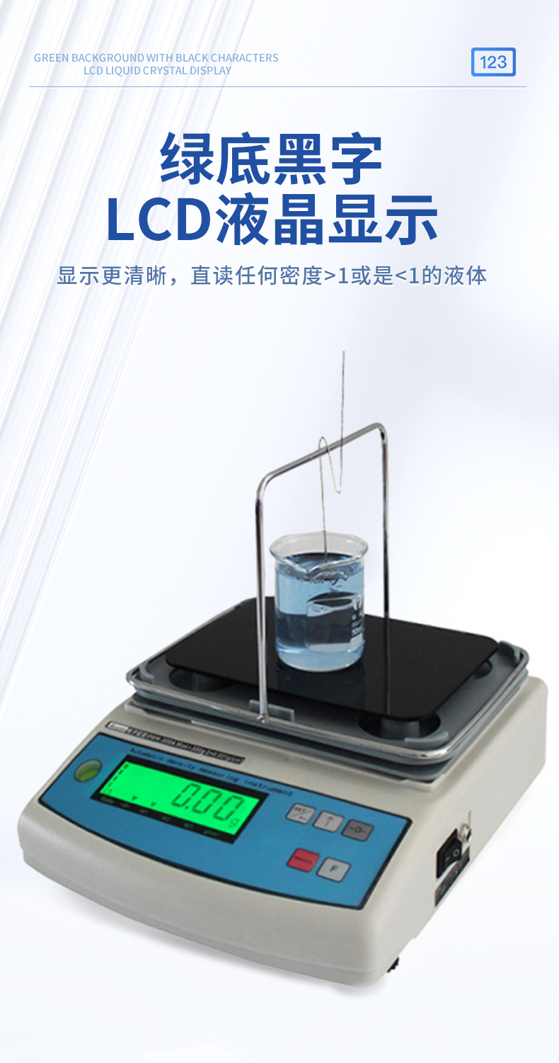 | 1.直读任何密度>1或是<1的液体. | 2.具有温度补偿设定、溶液补偿设定功能,更人性化的操作、更符合现场作业需求 | 3.密度测量台一体注塑成型,安装方便快速,使用时间更长. | 4.采用不锈钢T型架具有极强的耐腐蚀性,专用砝码挂钩极大地降低了吊栏线浮力所造成的误差 | 5.具有密度上、下限功能,可判定待测物的比重合格与否。设有蜂鸣器装置 | 6.内置蓄电池,选配防风罩,更适合现场测试. | 7. 绿底黑字LCD液晶显示,显示更清晰 |
